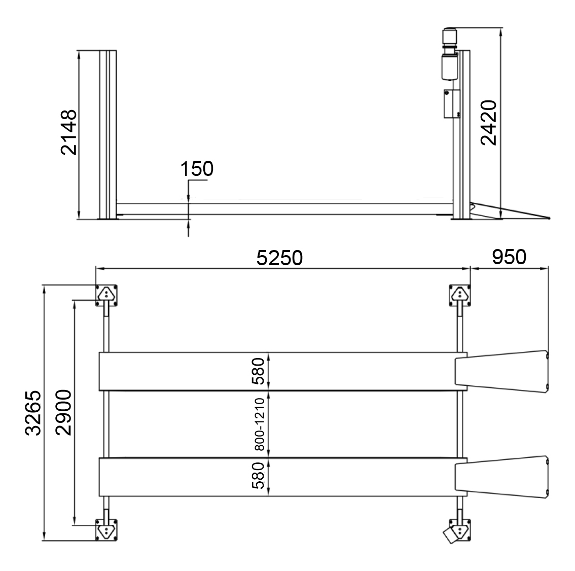 Подъемник четырехстоечный электрогидравлический, г/п 5000 кг., 2,2 кВт, высота подъема 1800 мм., размеры платформ 5230x580 мм, платформы - гладкие