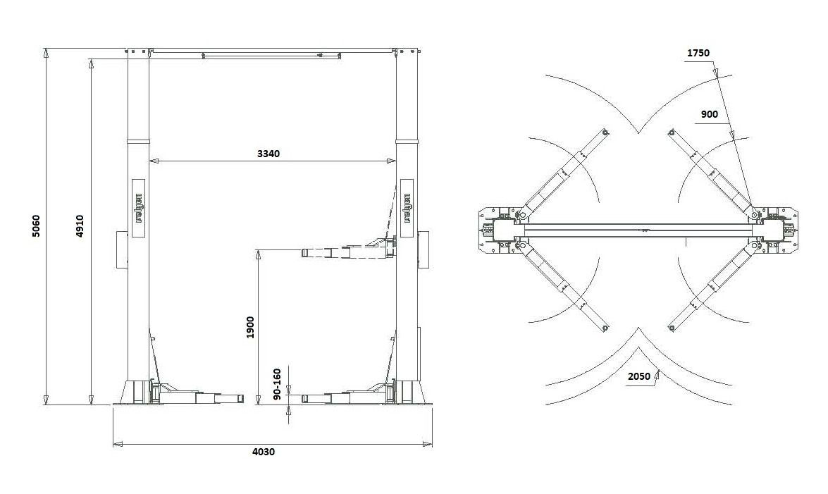 Подъемник двухстоечный электрогидравлический, асимметричный, г/п 5500 кг., 3 кВт, высота подъема 1900 мм., расстояние между стойками 3340 мм., высота до верхней балки 4910 мм., с верхней синхронизацией стальным тросом, электростопора.