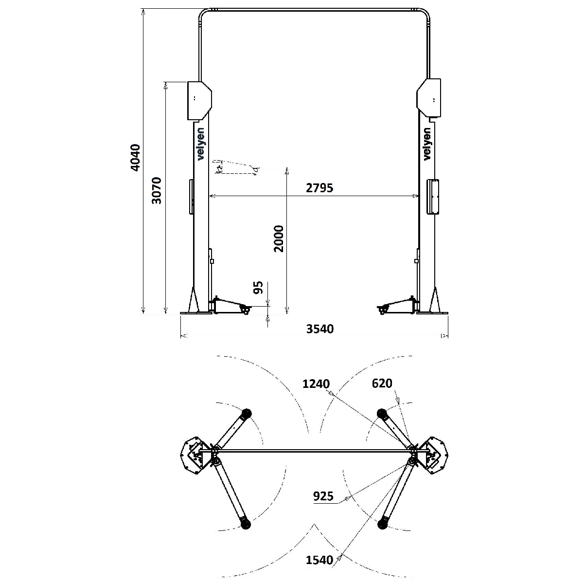 Подъемник двухстоечный электромеханический, асимметричный, двухмоторный, г/п 3500 кг., 2х2,4 кВт, высота подъема 2000 мм., расстояние между стойками 2795 мм., верхняя электронная синхронизация.