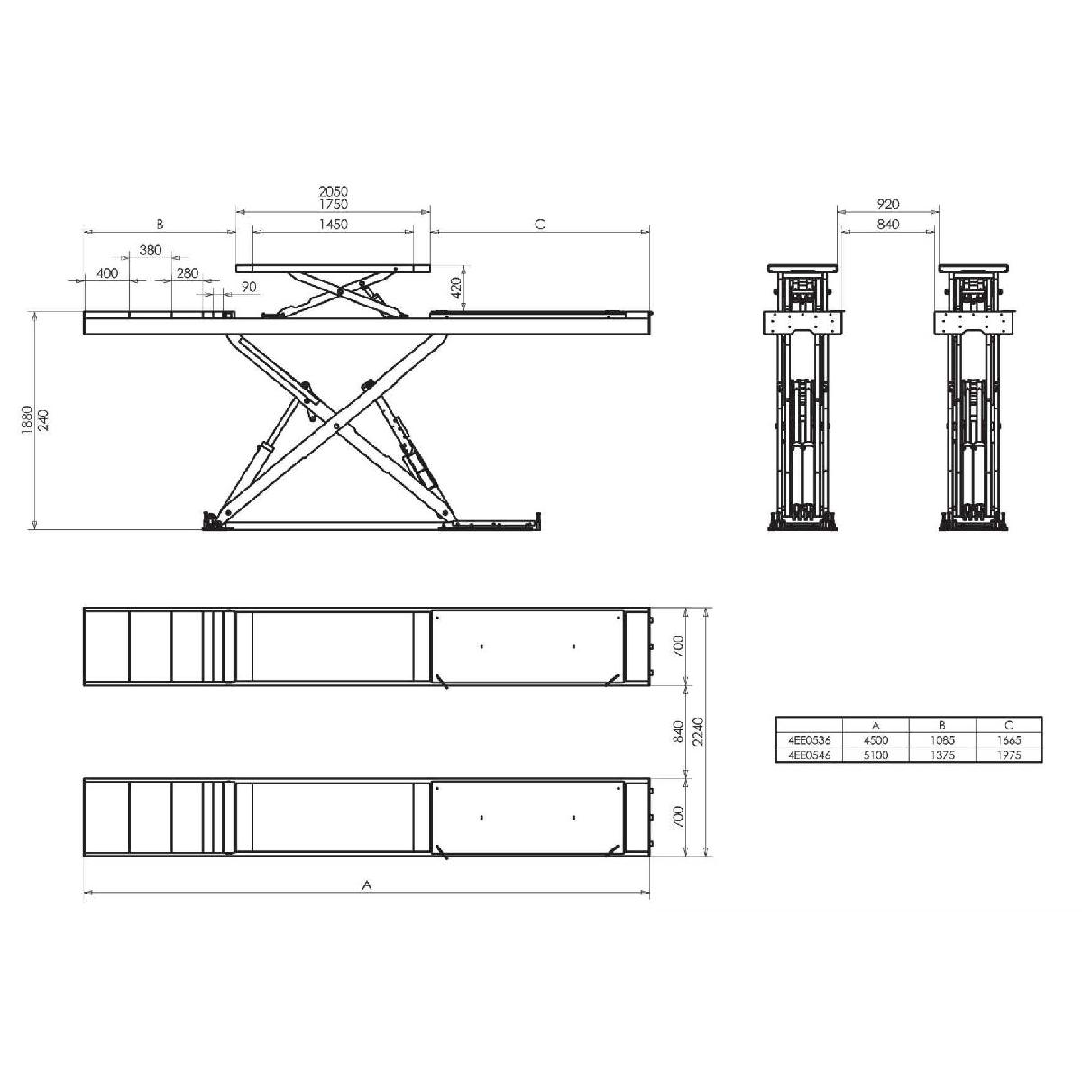 Подъемник ножничный, электрогидравлический, г/п 5500 кг., 2,2 кВт, высота подъема 1880 мм., размеры платформ 5100х700 мм, расстояние между платформами 800 мм, платформы - для сход-развала.