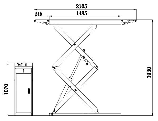 Подъемник ножничный, электрогидравлический, напольный, г/п 3500 кг., 2,2 кВт, высота подъема 1930 мм., размеры платформ 1485-2105х660 мм., клиренс 105 мм.