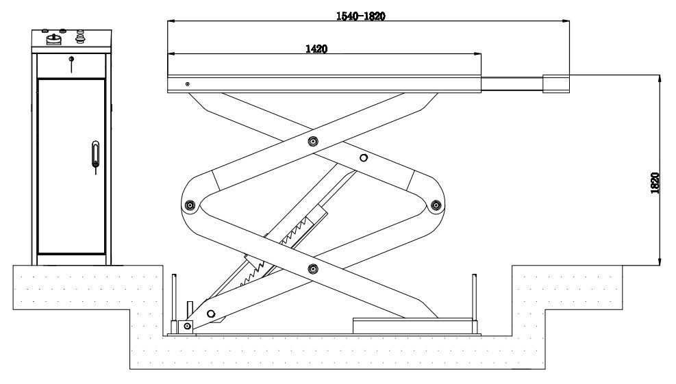 Подъемник ножничный, электрогидравлический, заглубляемый, г/п 3600 кг., 2,2 кВт, высота подъема 1820 мм., размеры платформ 1540-1820х550 мм.
