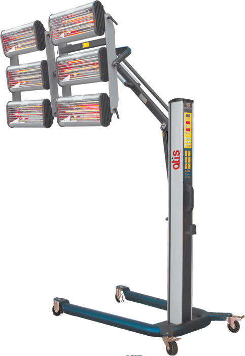 Стойка с пневмоцилиндром, две кассеты с тремя рядами горизонтально расположенных ламп; электронное программирование времени и мощности предварительной и основной сушки; возможность изменения площади, а также скорости сушки за счёт изменения угла наклона каждого ряда ламп. Мощность 6 ламп х 1000 Вт., 230 В. Площадь нагрева 1800мм х1000мм