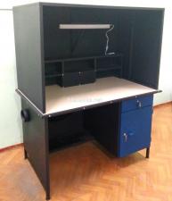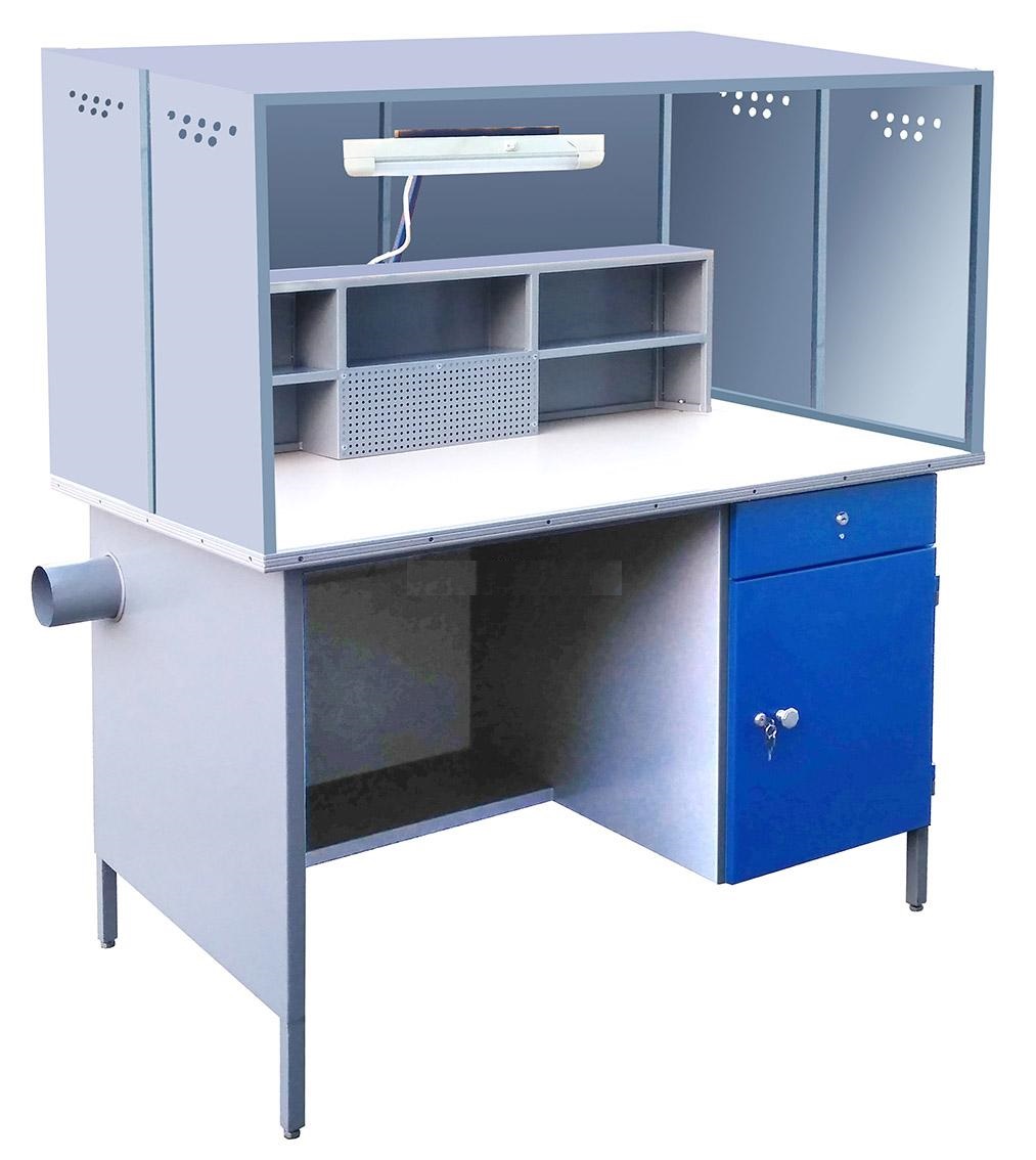 Столешница толщиной 17 мм из ДСП, обшитой лабораторным пластиком Labio или стеклотекстолитом, по периметру алюминиевый уголок, Тумбочка с двумя полками и замком, Экран из листовой стали с боковыми стенками, Боковые стенки стола из стального листа, Съемный экран с 6 полками, Светильник с лампой дневного света, Полка-стенка, Полка для паяльника, Выдвижной ящик, Вентиляционная решетка с нижним отбором воздуха, Сетевой фильтр с термореле защиты, Болт заземления, Дополнительно вспомогательное оборудование.