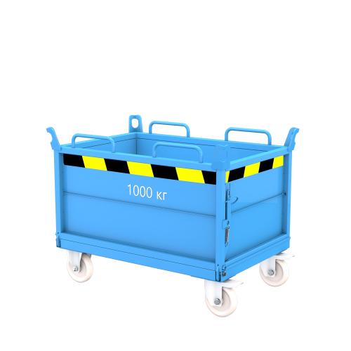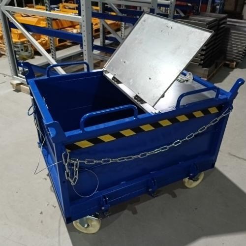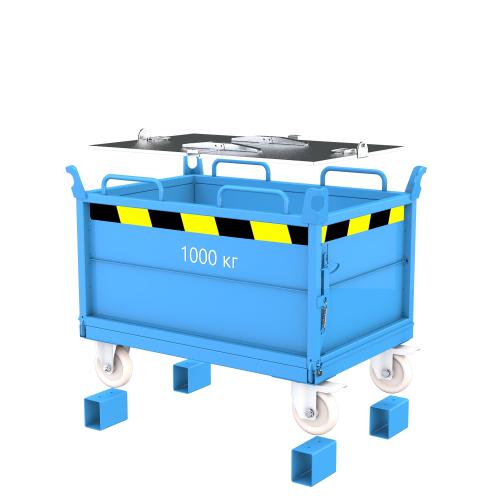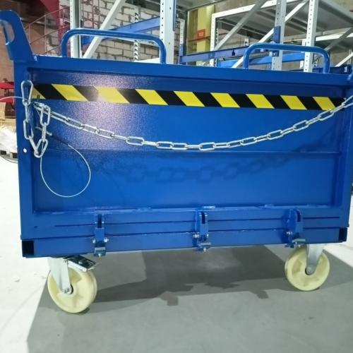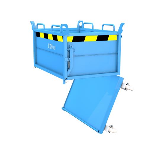 Особенность этой модели – откидное дно. Угол открытия составляет 60гр. Бак с учетом конструктива – негерметичный и не может удерживать жидкости. Контейнер может поставляться на стационарных опорах или на полиамидных колесных. Полиамидные колеса обладают повышенными нагрузочными характеристиками, устойчивы к металлической стружке, эргономичны даже при максимальной нагрузке, надежно фиксируют контейнер. Контейнер обслуживается вилочным погрузчиком или краном. Конструктивом предусмотрена возможность установки контейнеров друг на друга для экономии производственных площадей. Возможен заказ крышки для контейнера с петлями под замок, как дополнительный аксессуар. По периметру бака сигнальная черно-желтая лента для повышения безопасности производственных процессов. За дополнительную плату 5% окрасим контейнер в стильные RAL 7016 или RAL 5012.