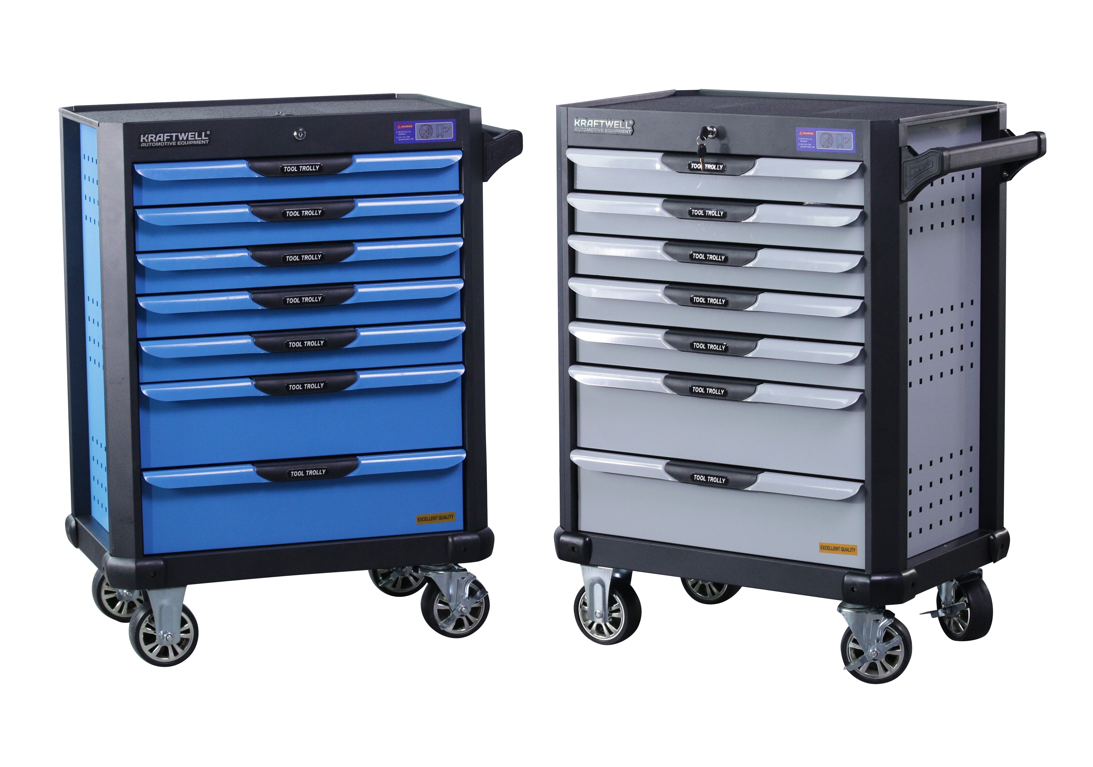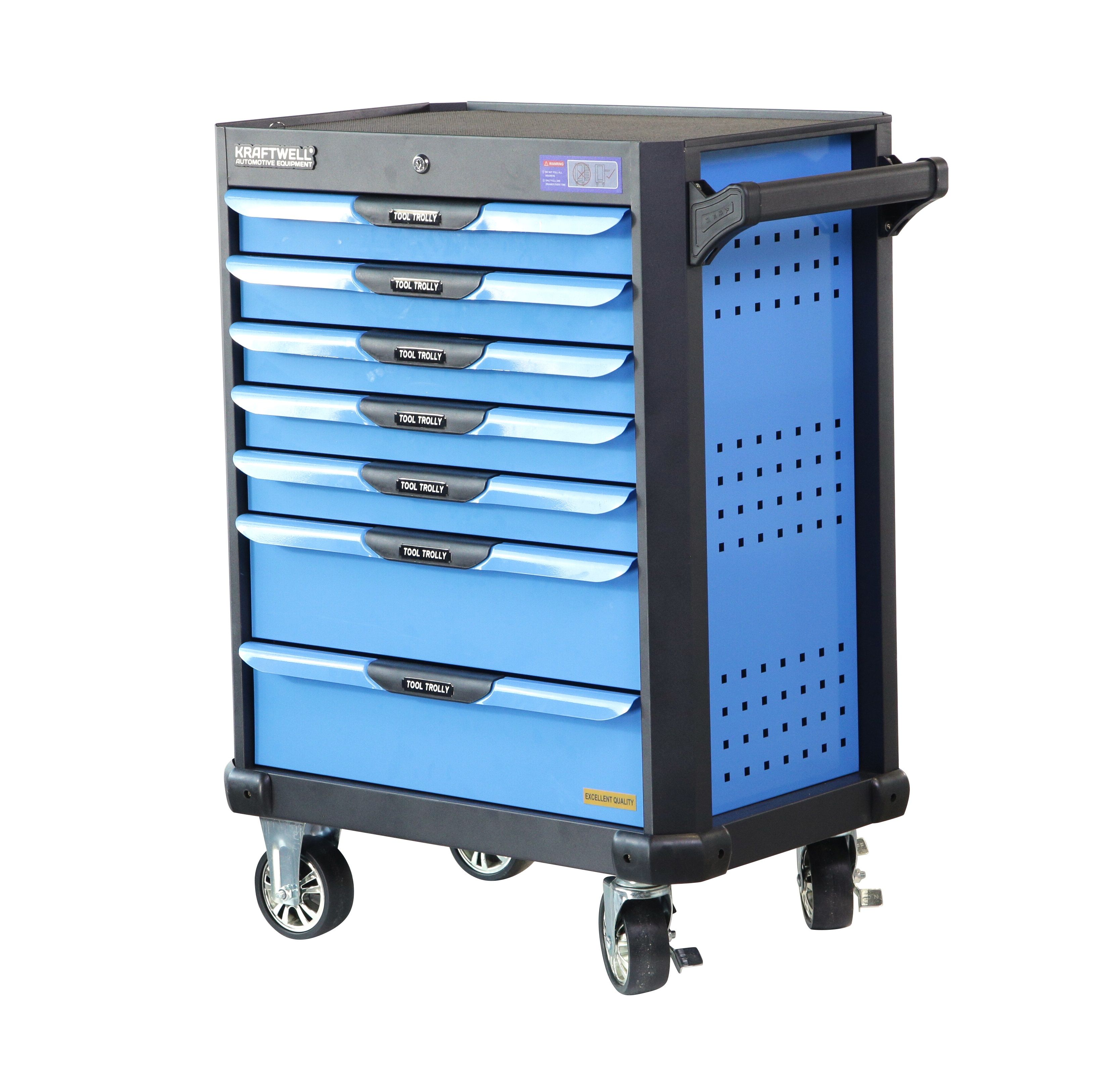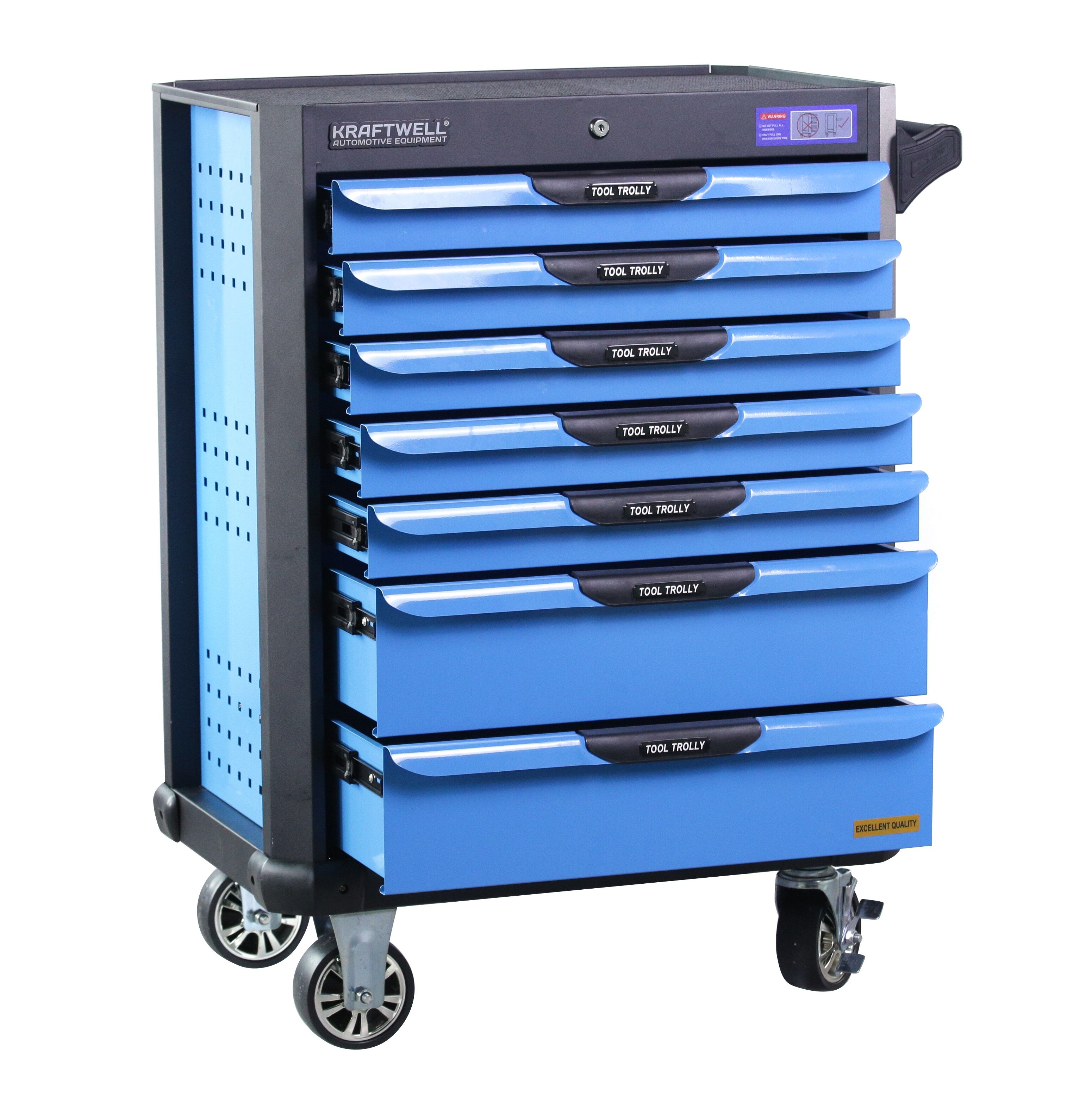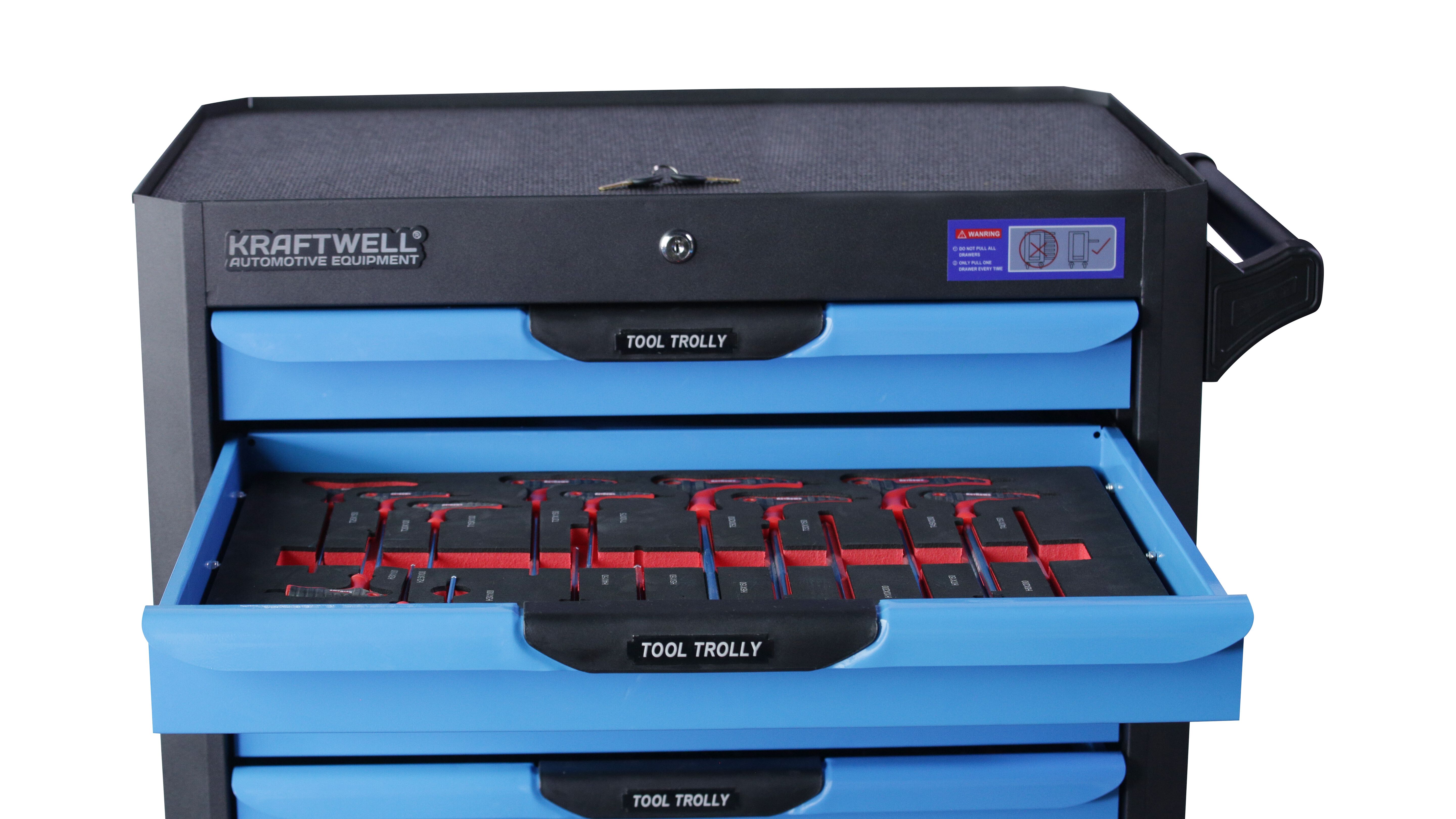 Инструментальная тележка KRW-TTB оснащена 7-ю выдвижными ящиками.В ПОДАРОК 6 ящиков укомплектованы ложементами с инструментом (277 предметов). Тележка предназначена для оборудования рабочих мест в автосервисах, мастерских и других производственных помещениях. Телескопические направляющие ящиков имеют механизм фиксации, не позволяющий самопроизвольно открыться ящику, даже если внутри находится инструмент, а также доводчиком, обеспечивающим плавное закрытие ящика. Корпус тележки изготовлен из высококачественной стали и окрашен порошковой краской. Перфорированные боковины предусматривают установку крючков. Для перемещения тележки предусмотрены обрезиненные стальные колеса Ф100 мм, одно из которых имеет стояночный тормоз.