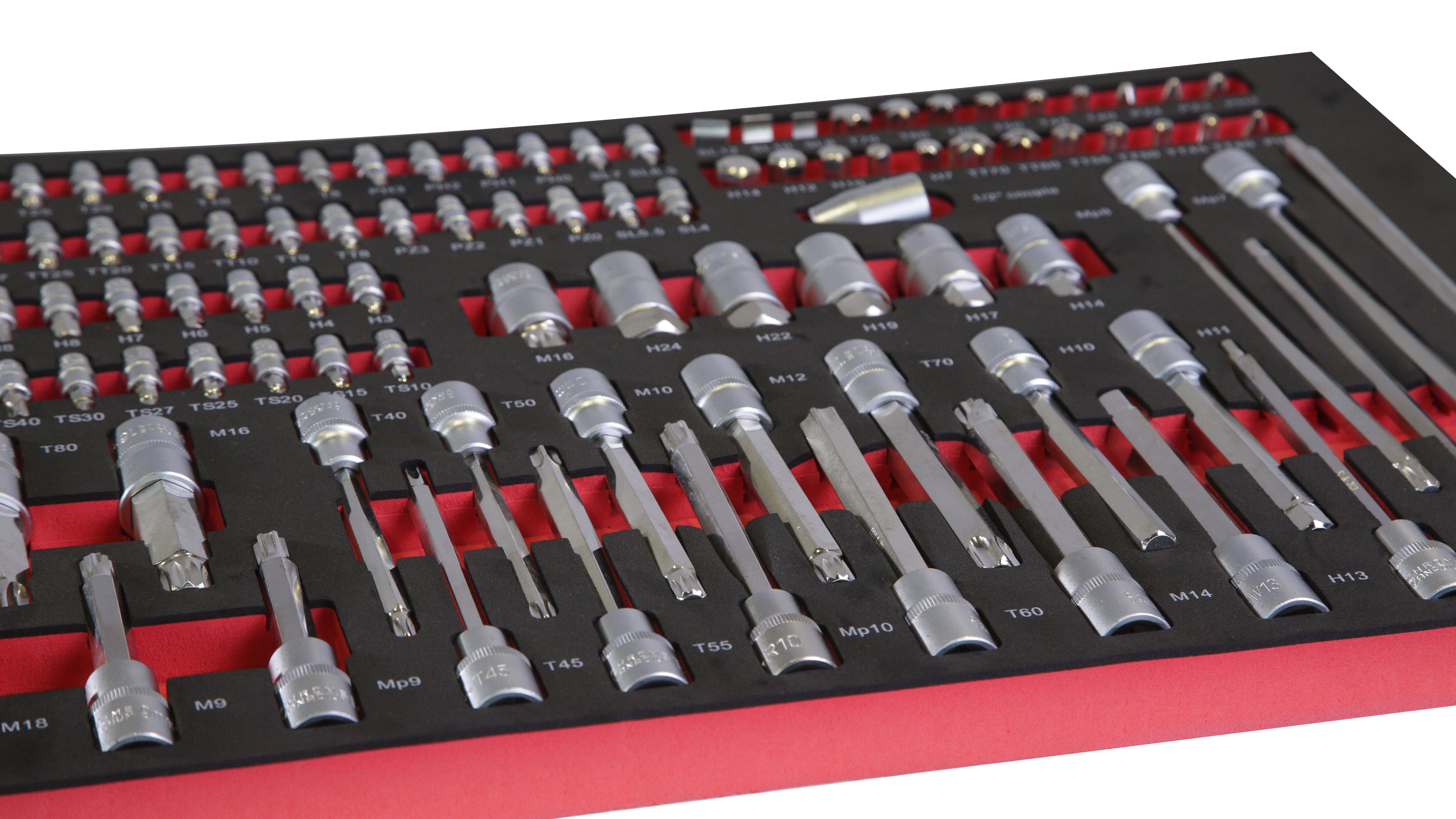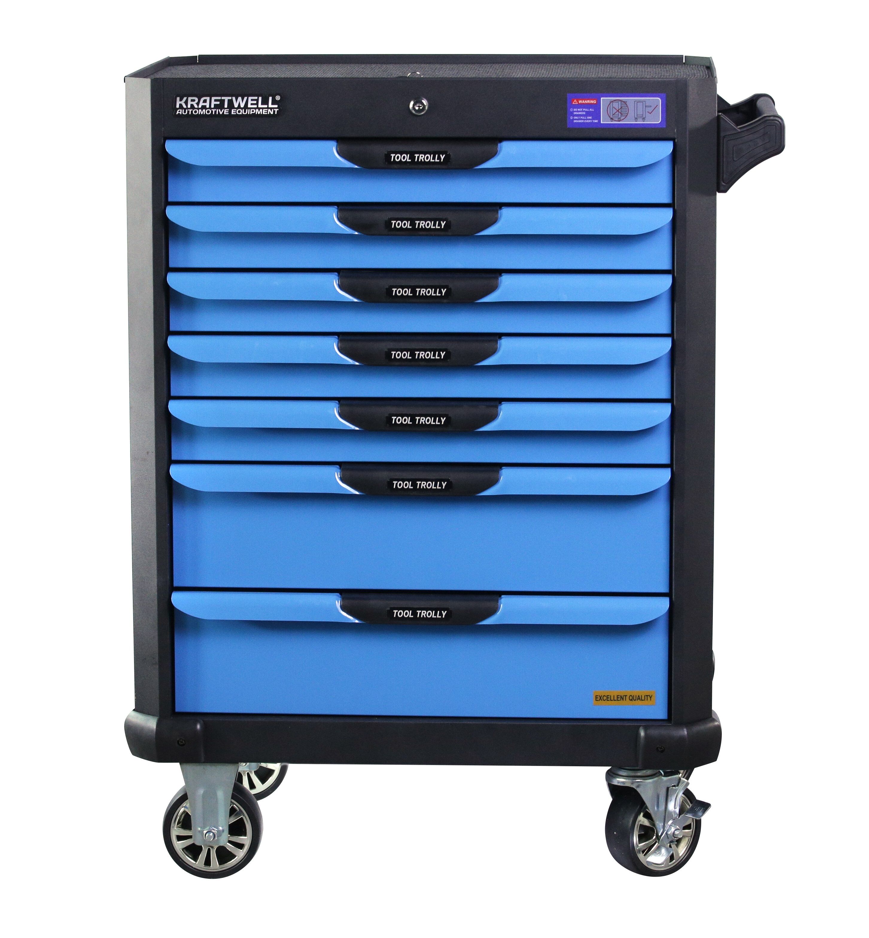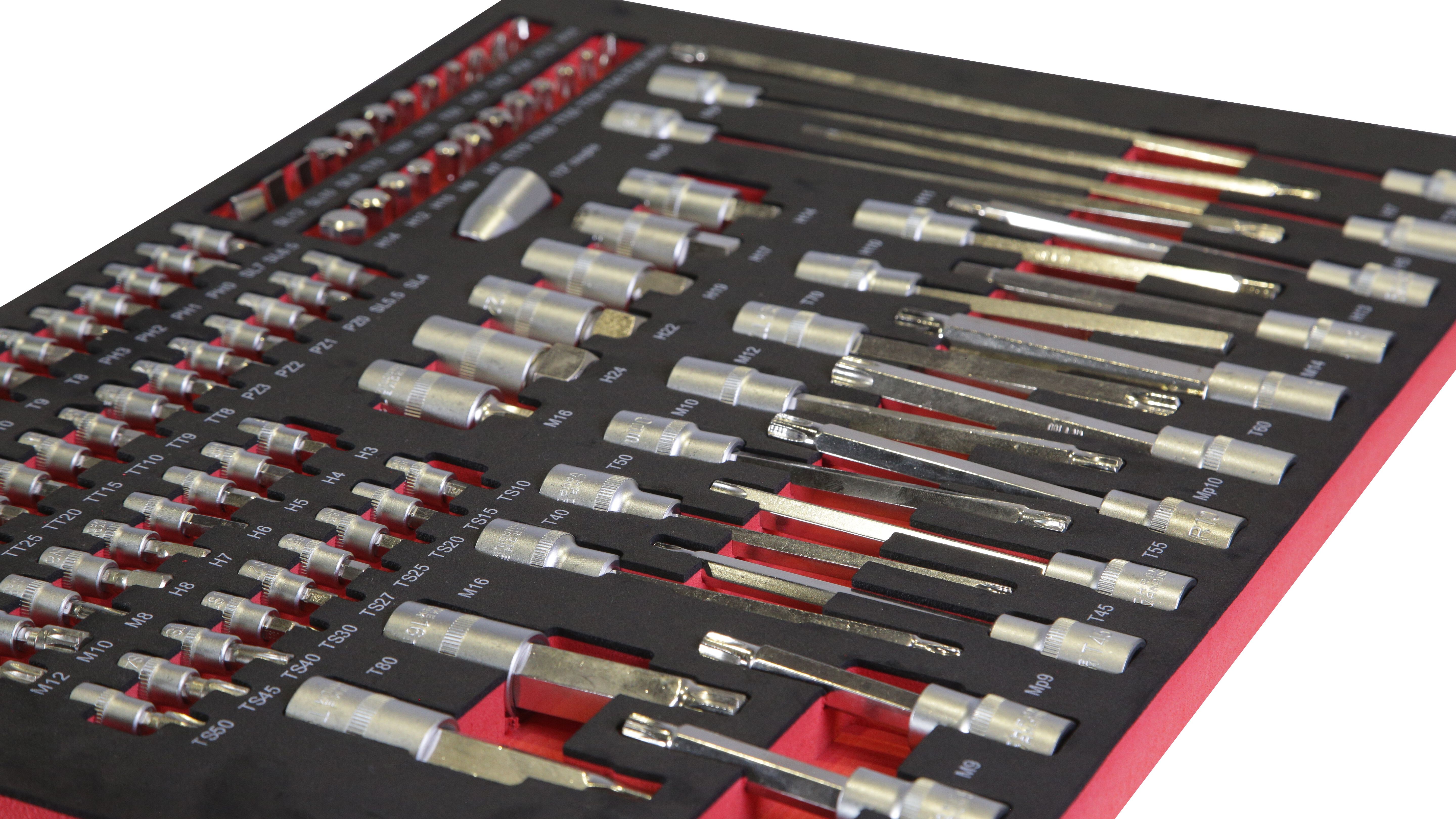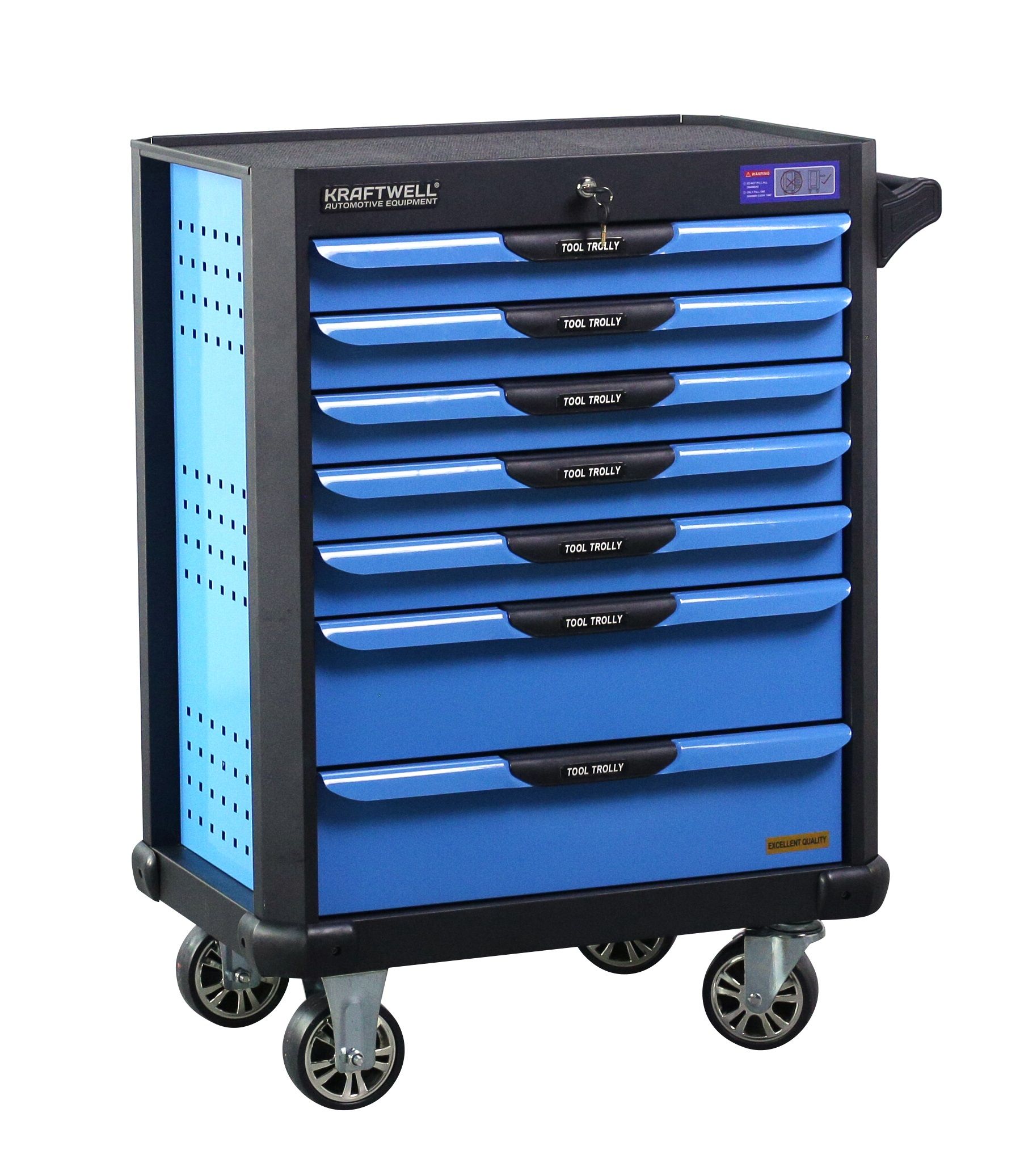 Инструментальная тележка KRW-TTB оснащена 7-ю выдвижными ящиками.В ПОДАРОК 6 ящиков укомплектованы ложементами с инструментом (277 предметов). Тележка предназначена для оборудования рабочих мест в автосервисах, мастерских и других производственных помещениях. Телескопические направляющие ящиков имеют механизм фиксации, не позволяющий самопроизвольно открыться ящику, даже если внутри находится инструмент, а также доводчиком, обеспечивающим плавное закрытие ящика. Корпус тележки изготовлен из высококачественной стали и окрашен порошковой краской. Перфорированные боковины предусматривают установку крючков. Для перемещения тележки предусмотрены обрезиненные стальные колеса Ф100 мм, одно из которых имеет стояночный тормоз.