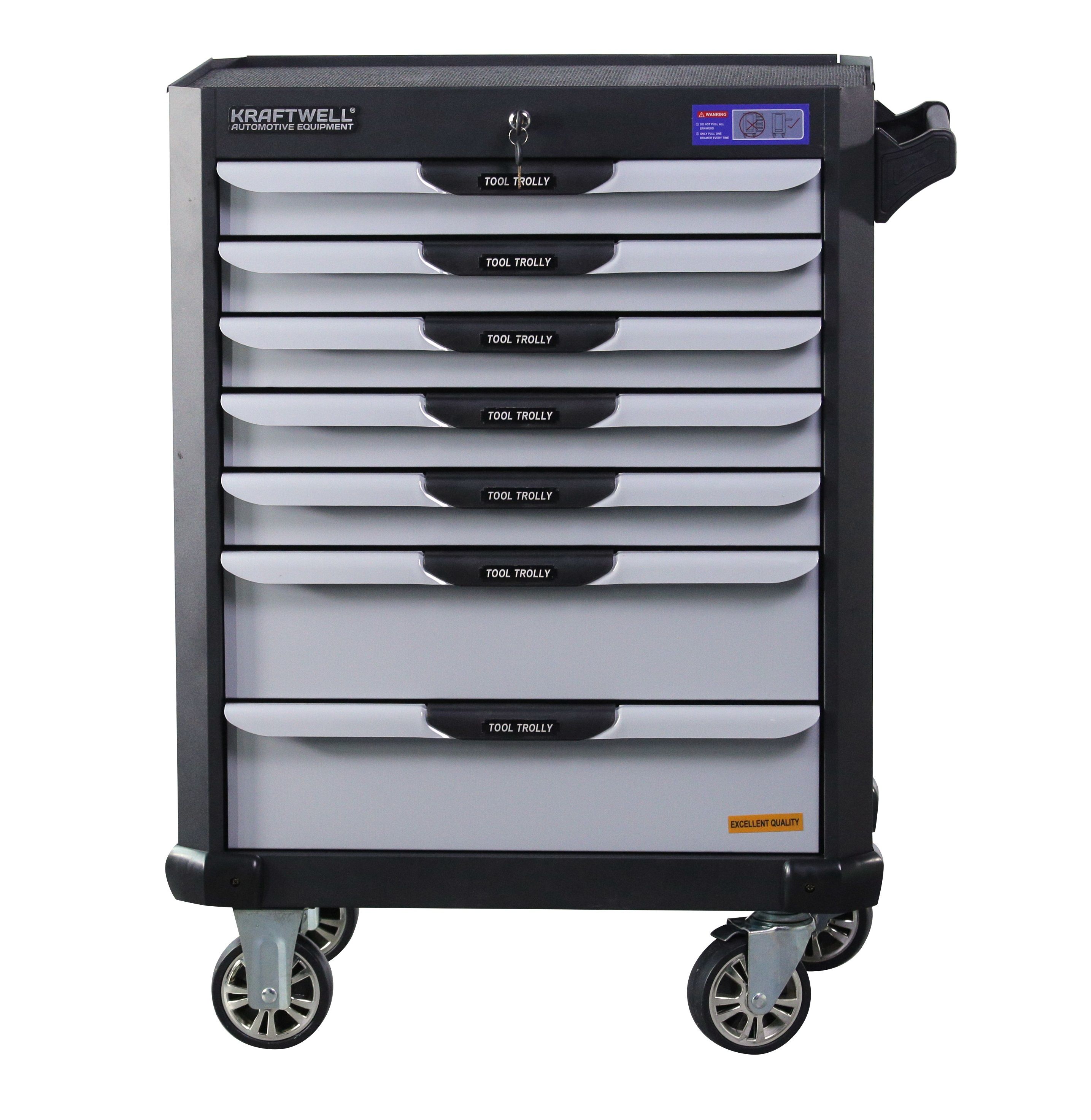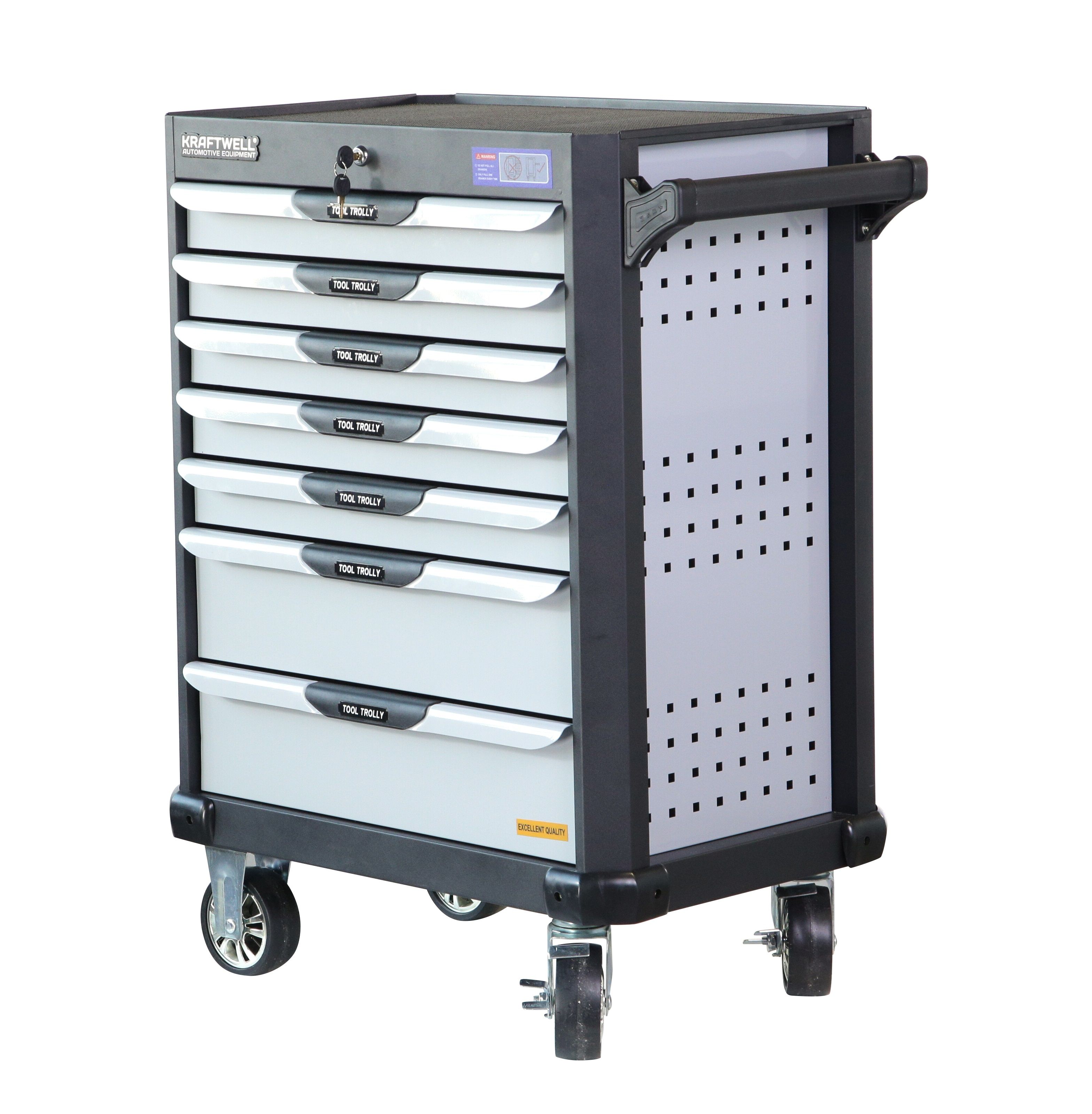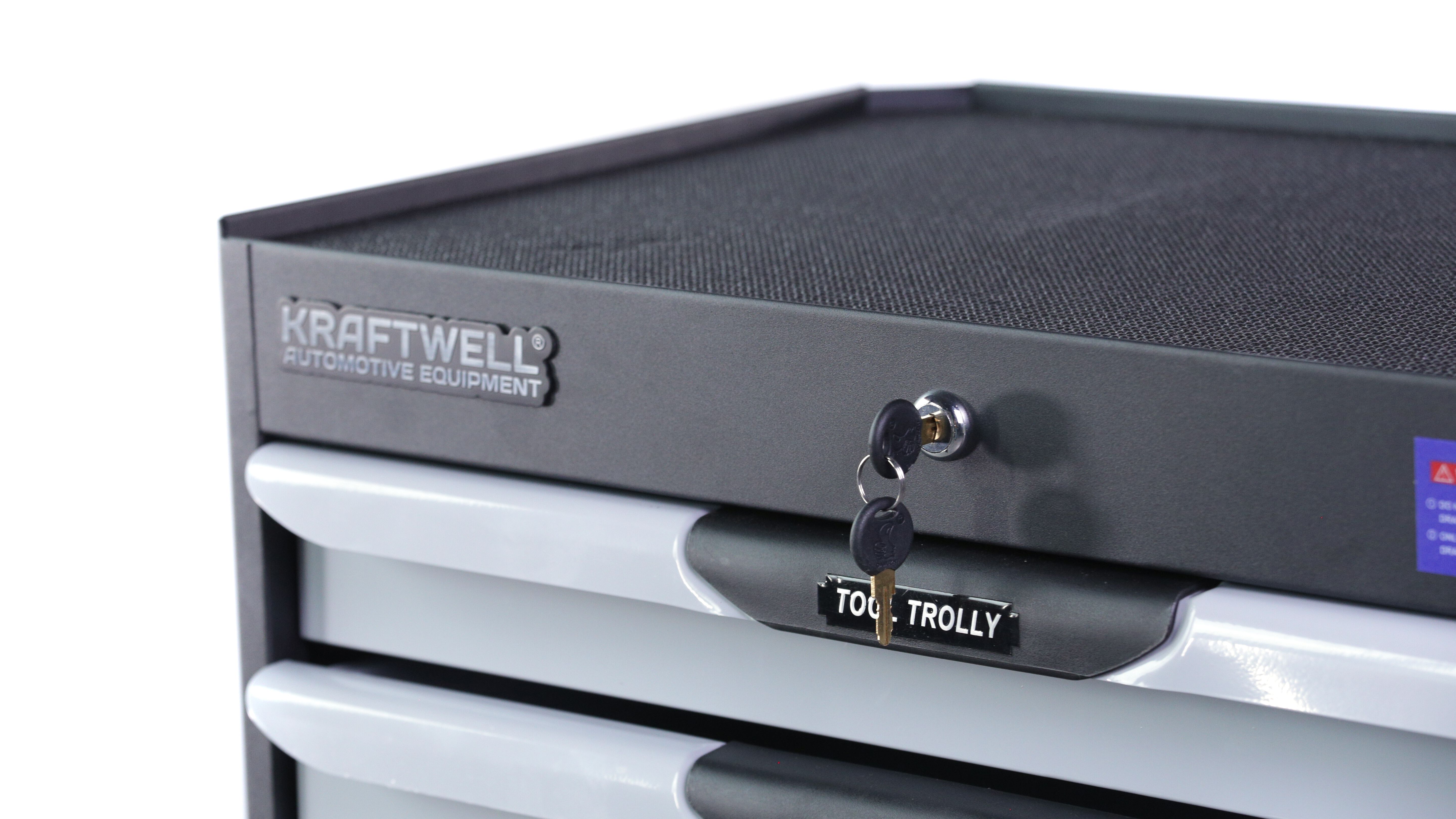 Инструментальная тележка KRW-TTG оснащена 7-ю выдвижными ящиками.В ПОДАРОК 6 ящиков укомплектованы ложементами с инструментом (277 предметов). Тележка предназначена для оборудования рабочих мест в автосервисах, мастерских и других производственных помещениях. Телескопические направляющие ящиков имеют механизм фиксации, не позволяющий самопроизвольно открыться ящику, даже если внутри находится инструмент, а также доводчиком, обеспечивающим плавное закрытие ящика. Корпус тележки изготовлен из высококачественной стали и окрашен порошковой краской. Перфорированные боковины предусматривают установку крючков. Для перемещения тележки предусмотрены обрезиненные стальные колеса Ф100 мм, одно из которых имеет стояночный тормоз.