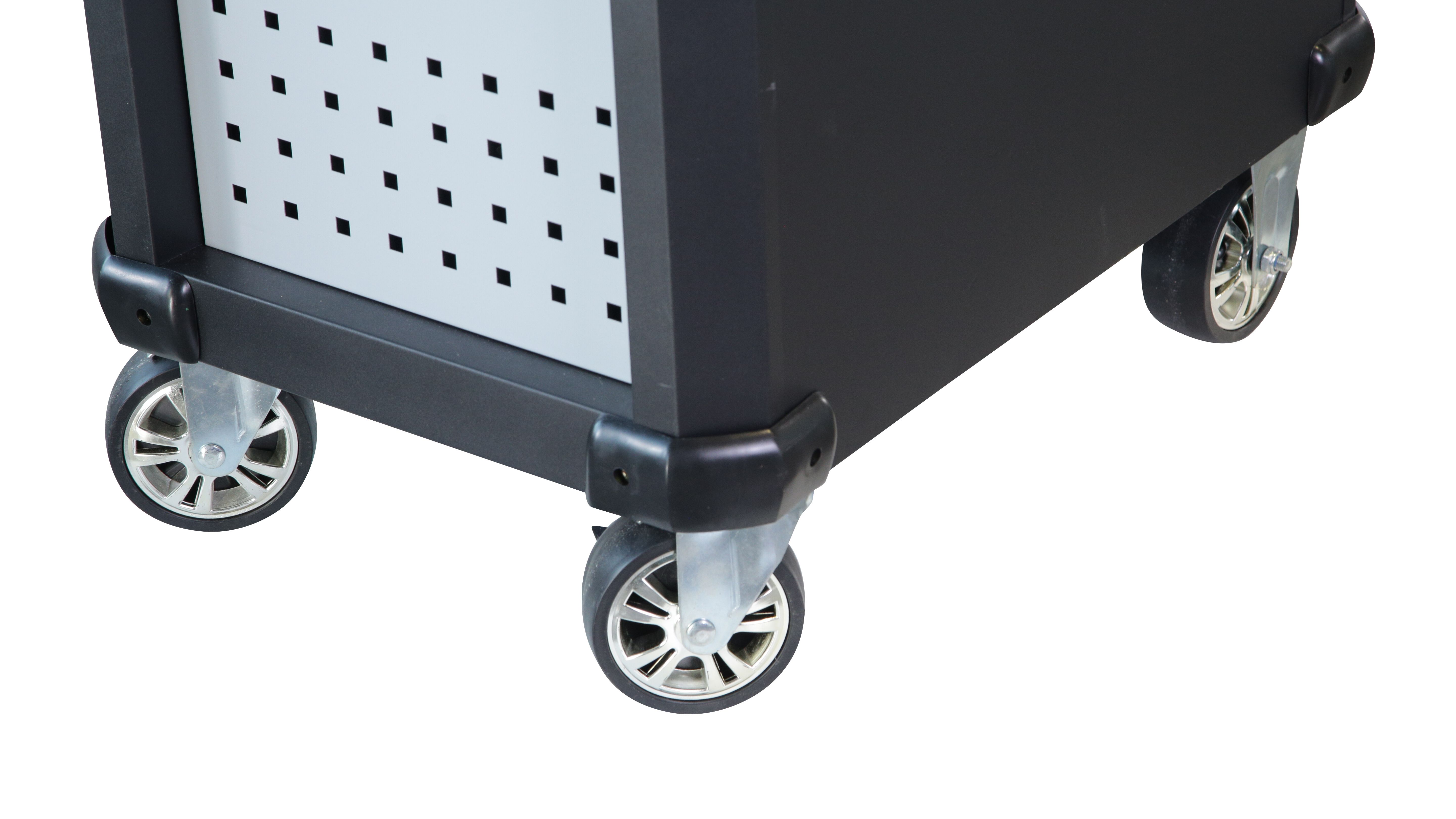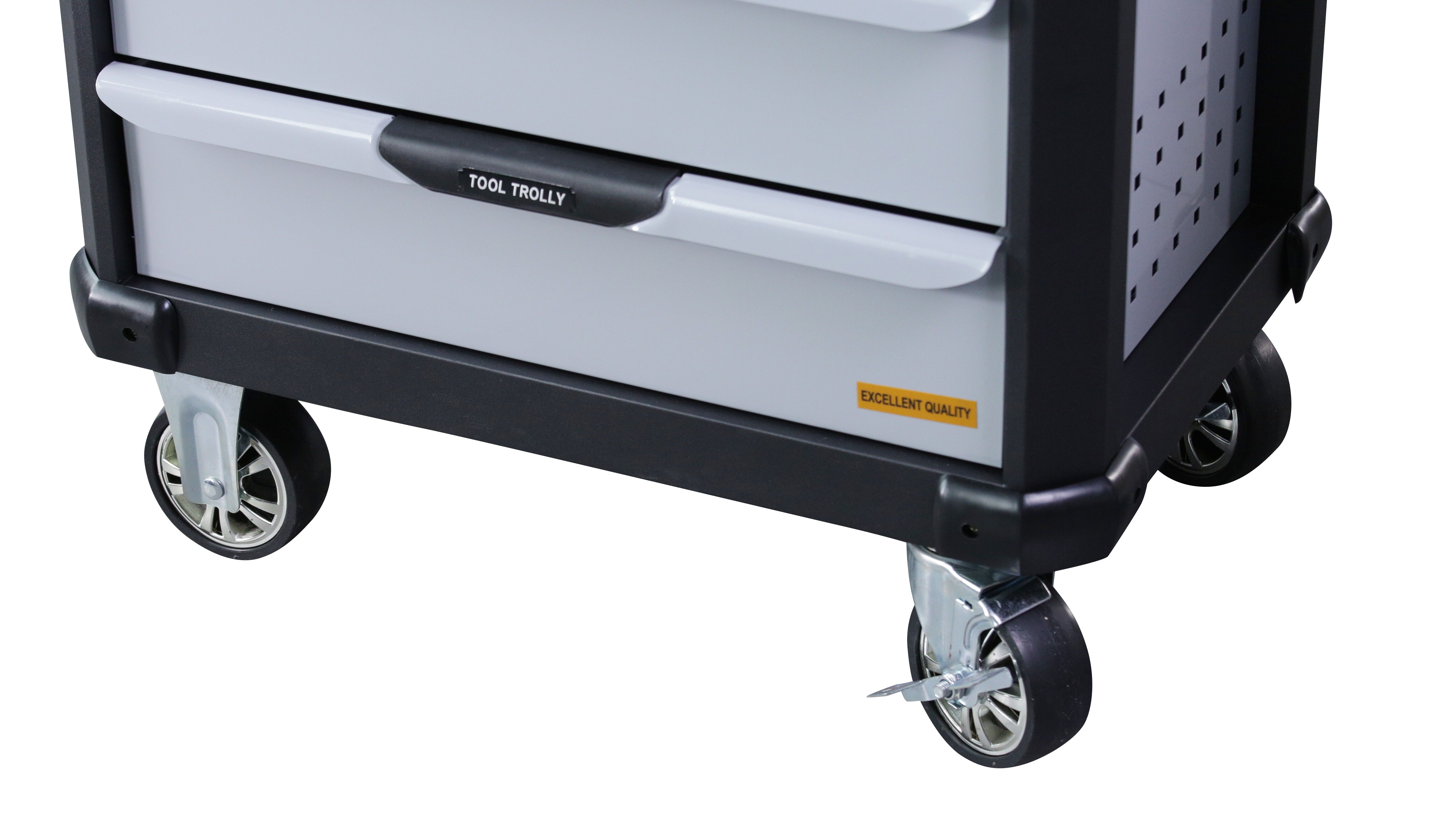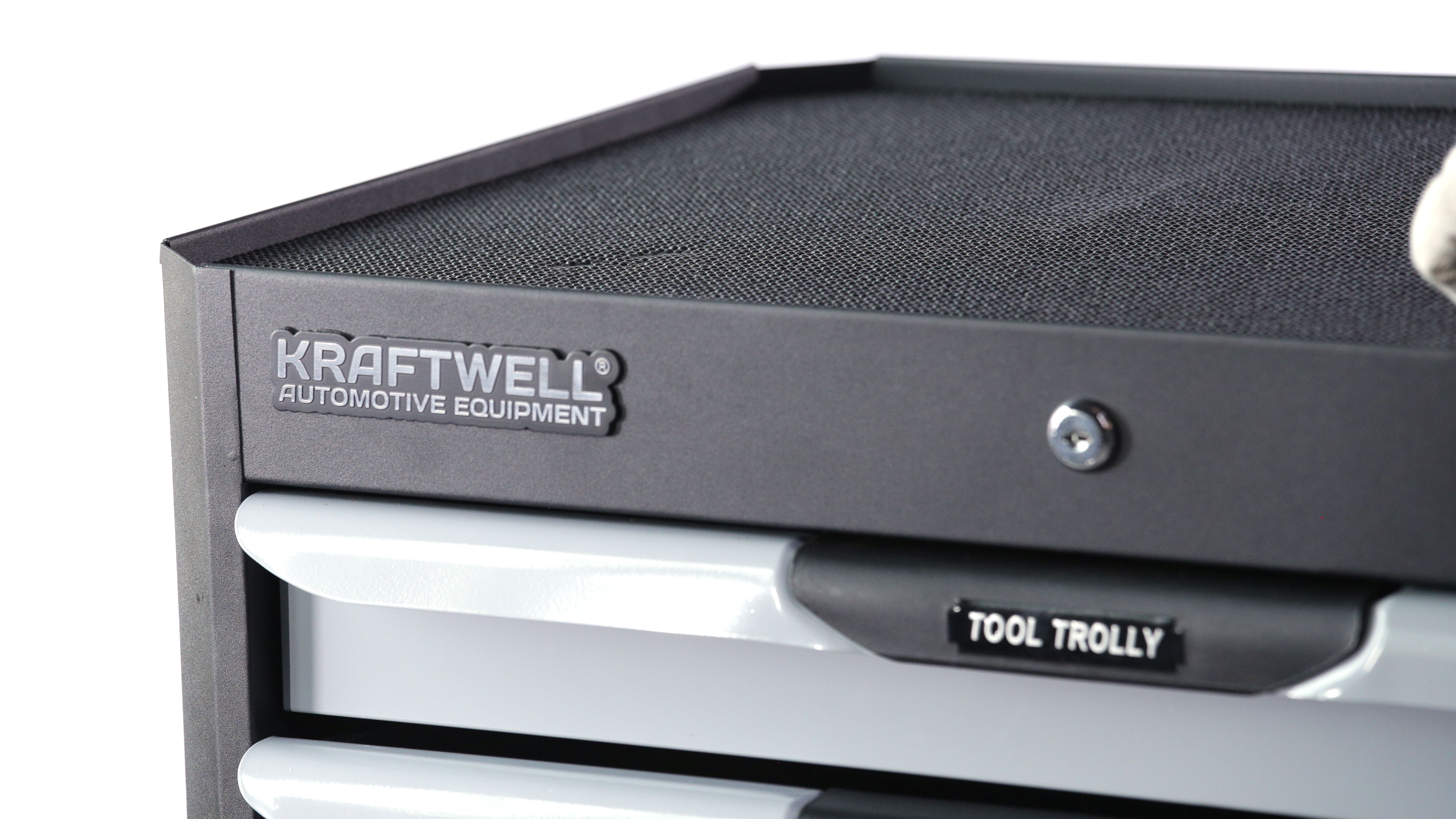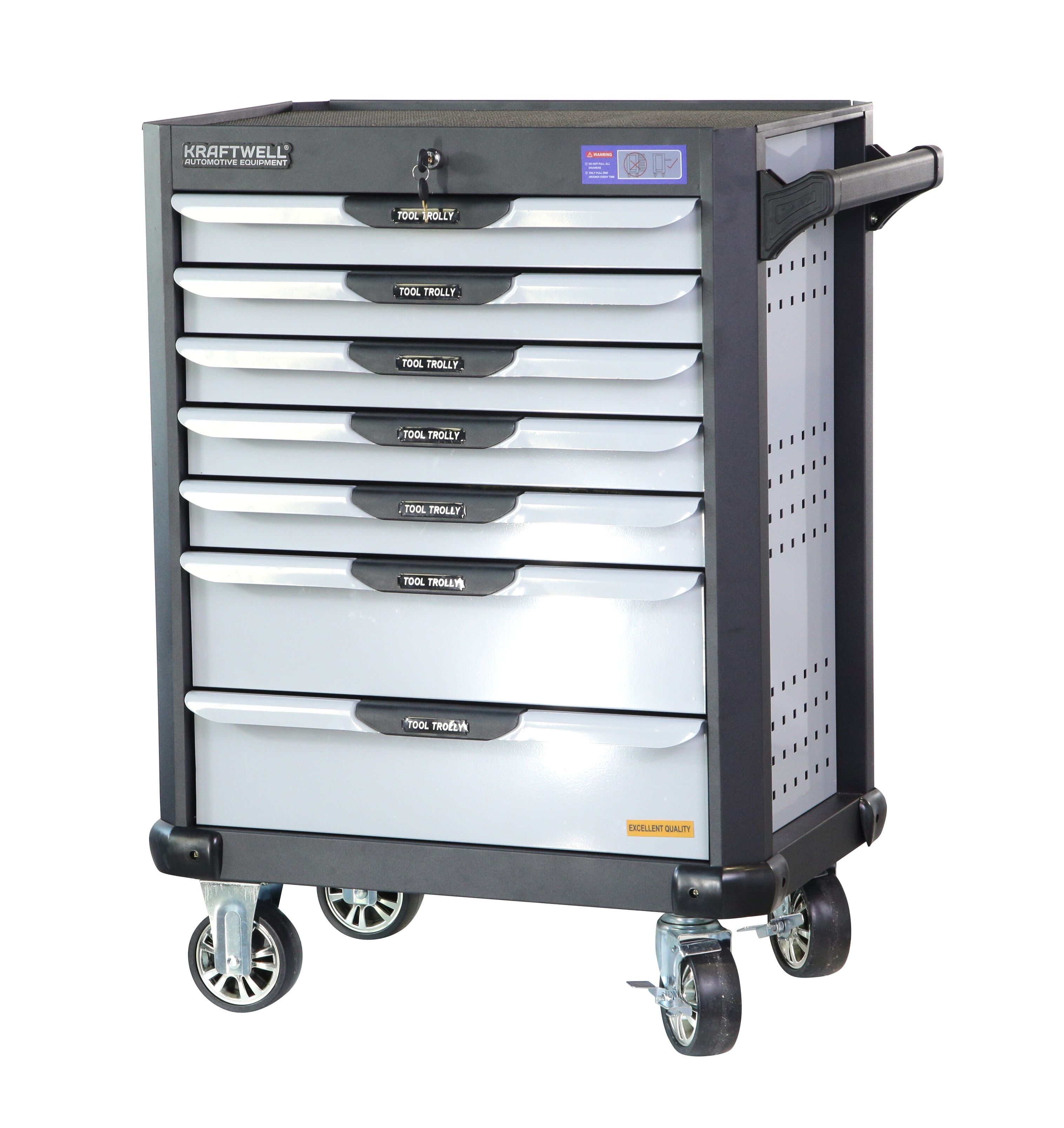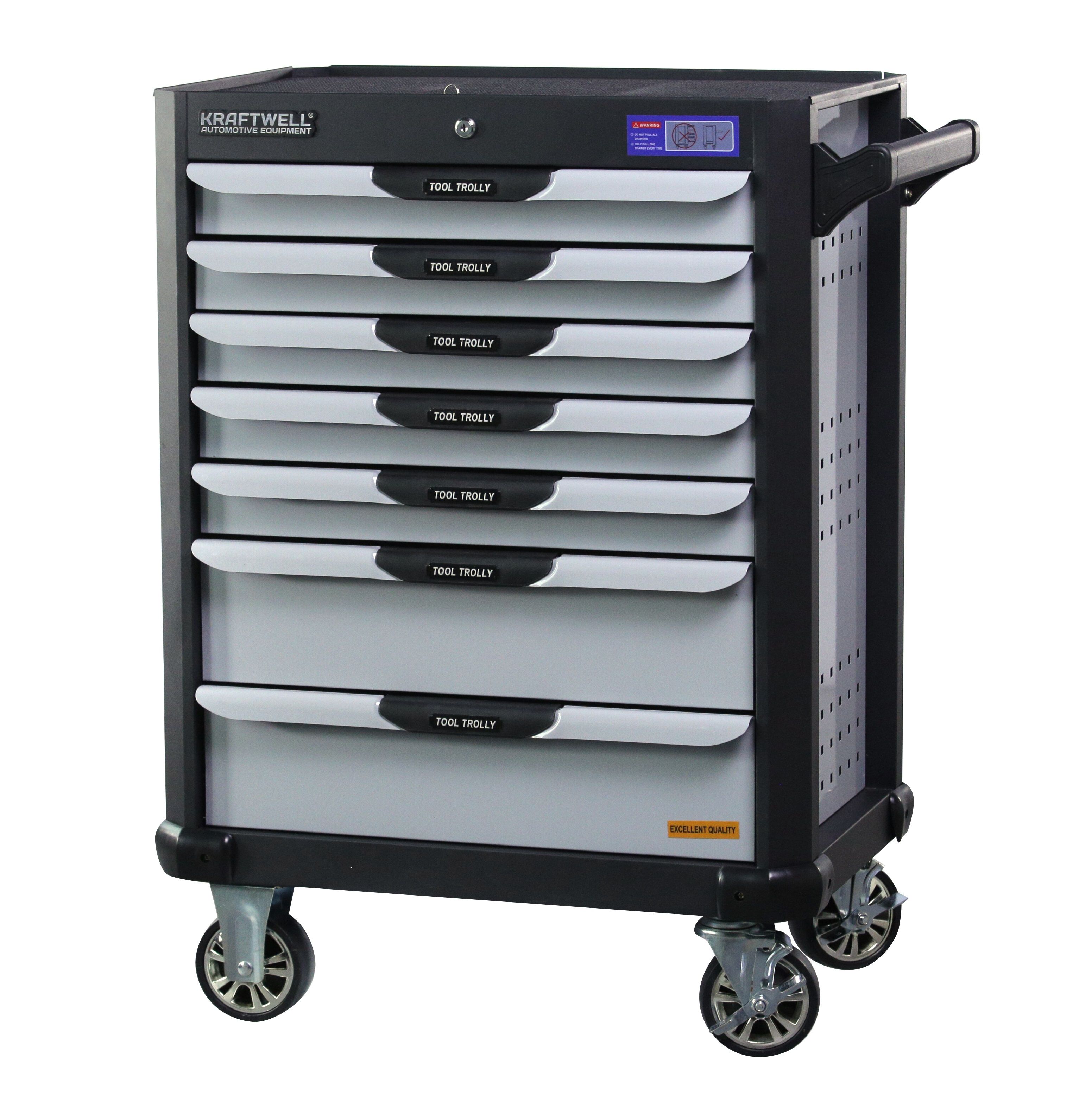 Инструментальная тележка KRW-TTG оснащена 7-ю выдвижными ящиками.В ПОДАРОК 6 ящиков укомплектованы ложементами с инструментом (250 предметов). Тележка предназначена для оборудования рабочих мест в автосервисах, мастерских и других производственных помещениях. Телескопические направляющие ящиков имеют механизм фиксации, не позволяющий самопроизвольно открыться ящику, даже если внутри находится инструмент, а также доводчиком, обеспечивающим плавное закрытие ящика. Корпус тележки изготовлен из высококачественной стали и окрашен порошковой краской. Перфорированные боковины предусматривают установку крючков. Для перемещения тележки предусмотрены обрезиненные стальные колеса Ф100 мм, одно из которых имеет стояночный тормоз.