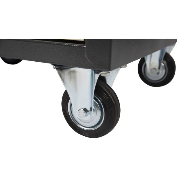 Тележка перемещается на надёжных промышленных колёсах, выдерживающих тяжёлые условия эксплуатации.