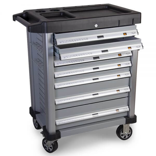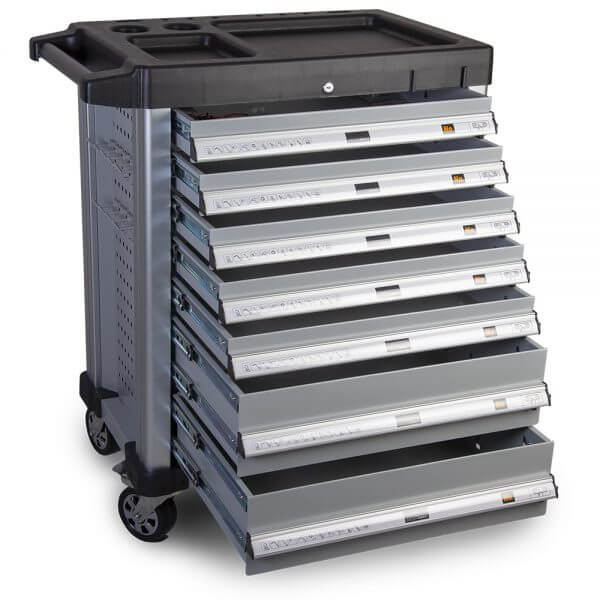 Тележка для хранения комплектов инструмента с расходными материалами и обеспечивает удобство и мобильность при выполнении различного вида работ. Особо прочные колеса с ножным стопором позволяют передвигать тележку непосредственно в зону проведения работ быстро и безопасно, сокращая временные затраты. Все механизмы ящиков выполнены из высокопрочной стали на подшипниках для легкости их перемещения и увеличения срока эксплуатации. Жесткая конструкция тележки рассчитана на повышенные нагрузки.