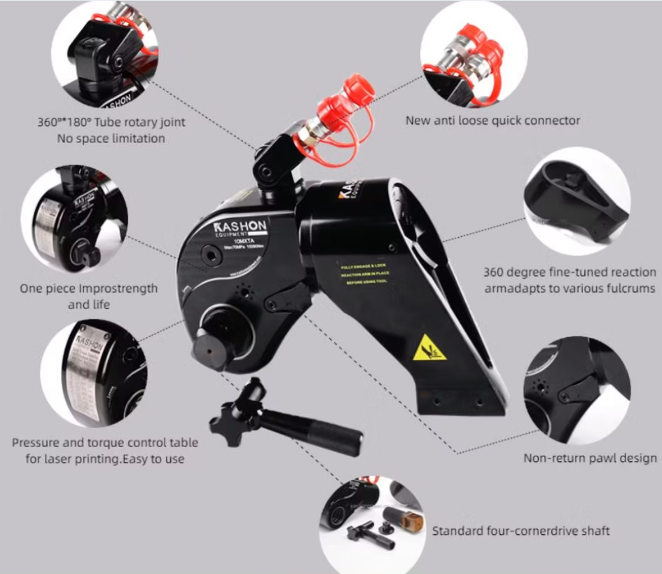 Гидравлический гаечный ключ с квадратным приводом KET размером квадратного сечения от 3/4 “до 2-1 / 2”, диапазон крутящего момента до 72000 Нм. Дополнительные аксессуары, такие как розетки, квадратный привод, удлиненные опорные рычаги, доступны по запросу клиента.