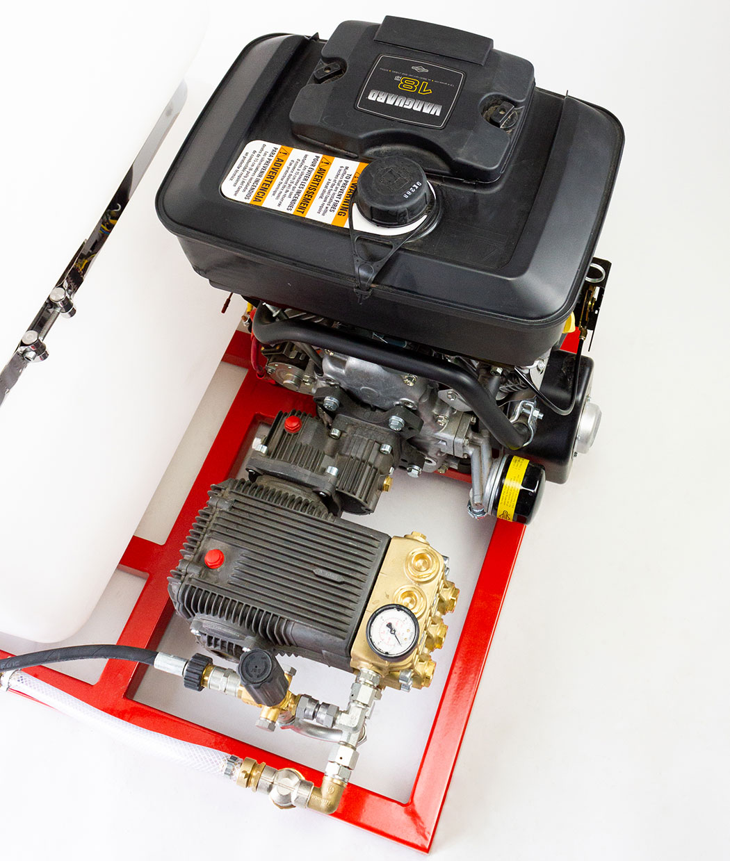 Прибор монтируется в автомобиль либо автомобильный прицеп. Принцип его работы очень прост – бензиновый двигатель, расположенный на металлическом каркасе, приводит в действие трехплунжерный итальянский насос Annovi Reverbari. Насос нагнетает давление от 0 до 150 бар, что позволяет эффективно прочищать трубы и каналы.
