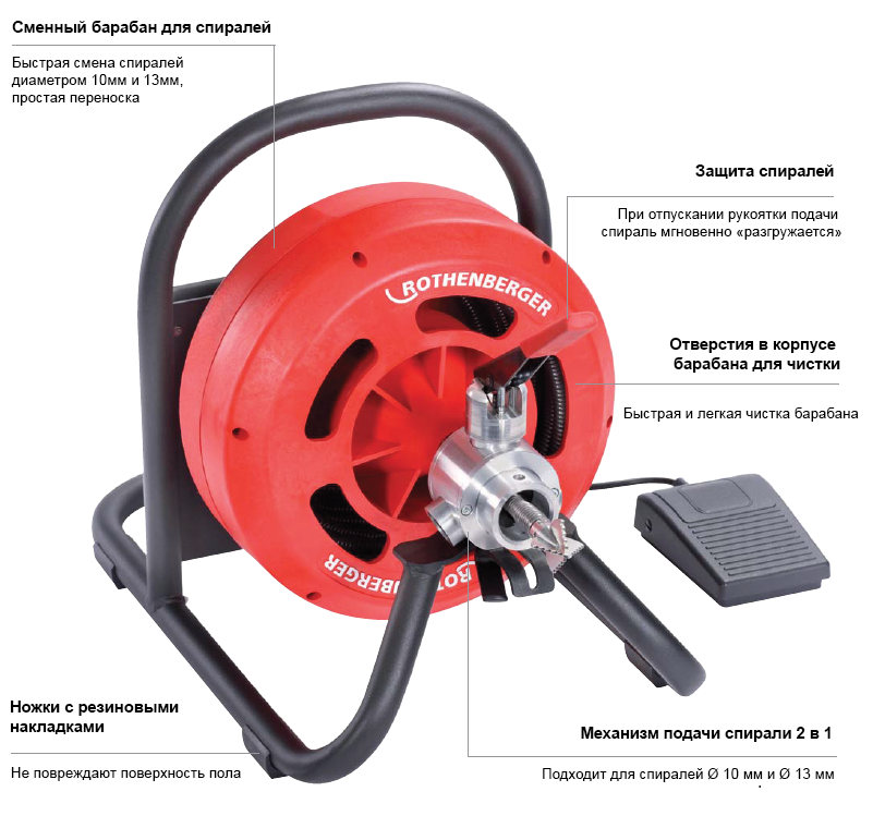 Прочистная машина Rothenberger Rodrum S10 - компактная прочистная машина барабанного типа с автоматической подачей для прочистки труб диаметром 40 - 100 мм. Спирали укомплектованы в съемный барабан. С данной моделью можно использовать спирали Ø10 мм, замена спиралей осуществляется быстро - просто меняется барабан. Максимальная рабочая длина 10 метров со спиралью 10 мм. Возможна установка барабана со спиралью ø 13 мм. Скорость подачи спирали 6-7 м/мин. Управление подачей спирали (вперед/назад) осуществляется при помощи педали. Мощность однофазного электрического двигателя 0,25 кВт. В комплекте большой выбор спиральных насадок для решения различных задач. Машина снабжена удобной ручкой для переноски. Идеальный вариант для предприятий ЖКХ, водоканалов, больниц, ресторанов и других общественных предприятий.
