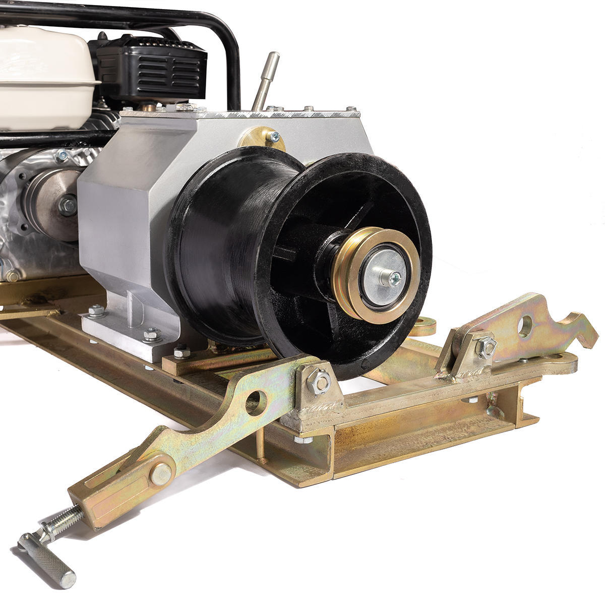 Лебедка тяговая автономная с бензиновым приводом и горизонтальным тяговым фрикционным барабаном предназначена для перемещения грузов по горизонтальной поверхности, протяжки кабеля и других видов работ в условиях отсутствия электроснабжения. Управление лебедкой осуществляется при помощи всего трех рычагов-ручек. Лебедка имеет правое и левое направление вращения вала переключаемые рычагом. Рычаг переключения скорости вращения позволяет осуществлять выбор скорости вращения вала – высокая либо низкая. Рычаг расцепителя служит для кратковременного разъединения двигателя от механизма редуктора и вновь его плавного соединения. Также, лебедка оборудована механизмом сцепления, предназначенным для передачи крутящего момента двигателя на вал редуктора лебедки, что значительно продлевает ее срок службы. Рама оснащена элементами для дополнительного закрепления на поверхности. Подходит для протяжки кабеля всех видов.