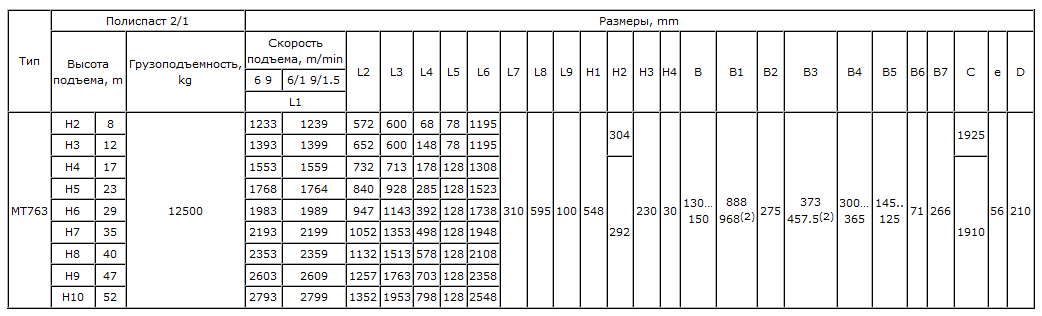 Передвижная электрическая канатная таль серии МТ 763 выпускается с 2-мя скоростями подъема 8 или12 м/мин. Тали серии МТ - модернизированная версия талей серии Т, отличается от них уменьшенными габаритными размерами и весом, сохряняя при этом надежность талей серии Т.