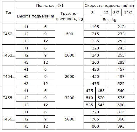 Передвижная электрическая канатная таль серии Т 45 с уменьшенной строительной высотой выпускается с 2-мя скоростями подъема 8 либо 12 м/мин. В стандартном исполнении тали присутствует микроскорость подъема в соотношении 1/2. Тали Т45 выпускаются в стандартном исполнении грузоподъемностью до 5 тонн и с высотами подъема до 12 метров.