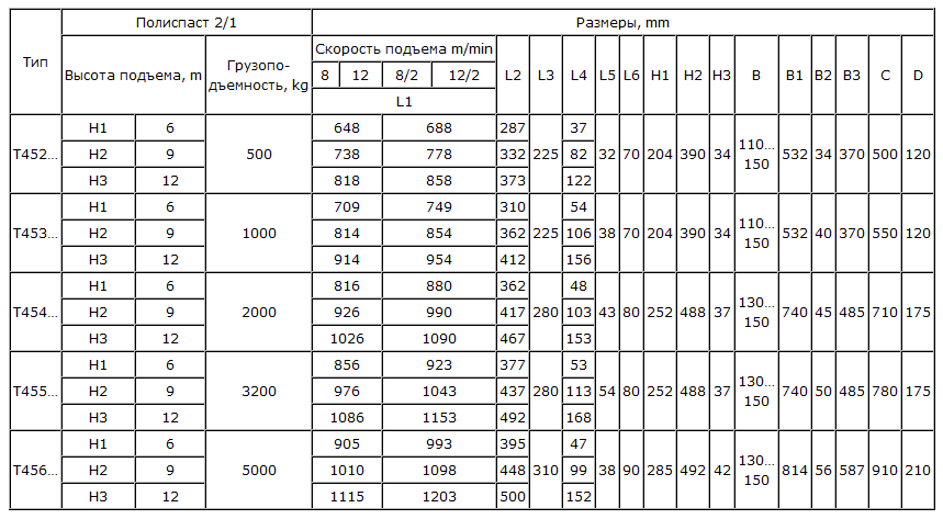 Передвижная электрическая канатная таль серии Т 45 с уменьшенной строительной высотой выпускается с 2-мя скоростями подъема 8 либо 12 м/мин. В стандартном исполнении тали присутствует микроскорость подъема в соотношении 1/2. Тали Т45 выпускаются в стандартном исполнении грузоподъемностью до 5 тонн и с высотами подъема до 12 метров.