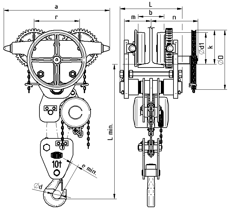 Таль Brano Z220 – передвижная цепная ручная шестеренная таль, оснащенная кареткой перемещения с ручным управлением для перемещения по горизонтальным крановым путям. Отличия от устаревшей серии Z210 – ходовая часть тали оснащена предохранительными бамперами. Таль Z220 0,5 – 10 т обычно производится с базовой высотой подъема 3 м. Возможность выбора высоты подъема от 3 м до 12 м.