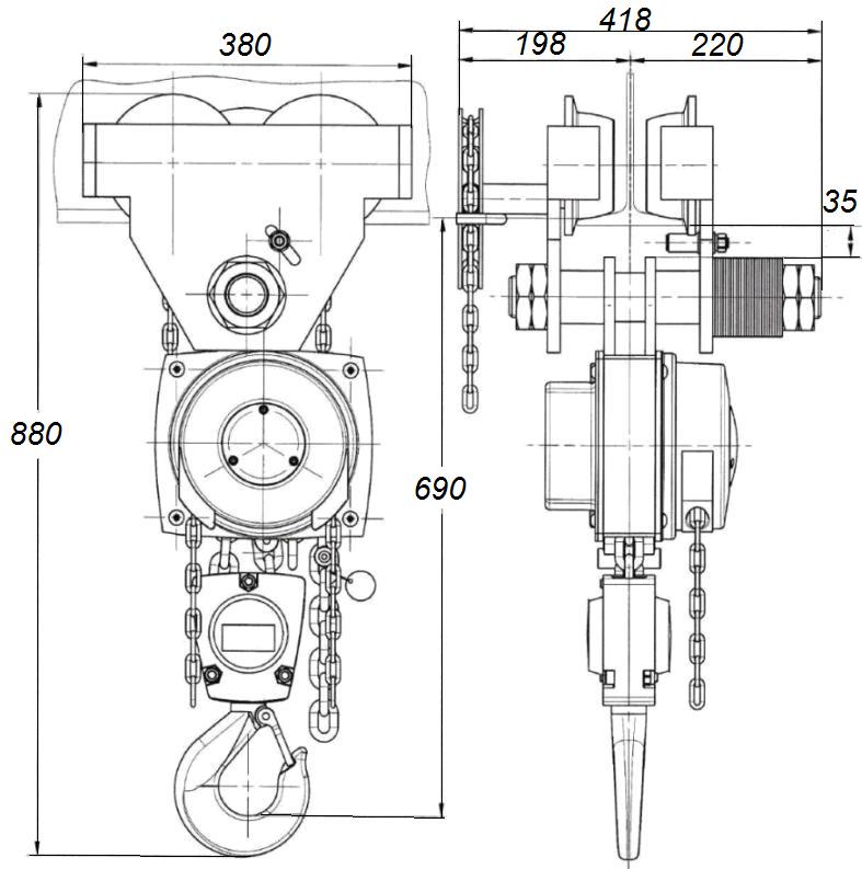 Таль ТРШБМ оснащена ручным приводом механизма передвижения. Перемещение тали по подвесному пути осуществляется приложением усилия оператора тали к тяговой цепи кошки, далее через тяговую звездочку на ведущие ролики.