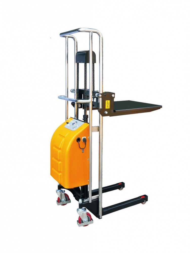 Конструктивные элементы электрических штабелеров — рама из высокопрочной стали и рабочие вилы с двойным антикоррозийным порошковым покрытием, защитный экран, аккумулятор и зарядное устройство. Управление подниманием и опусканием груза выполняется с помощью расположенного на корпусе рычага с электроприводом. В зависимости от высоты подъема мачта имеет две или одну секцию.