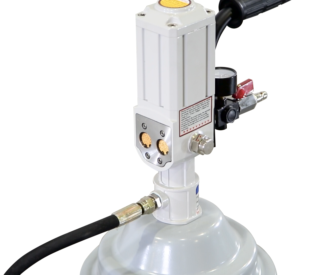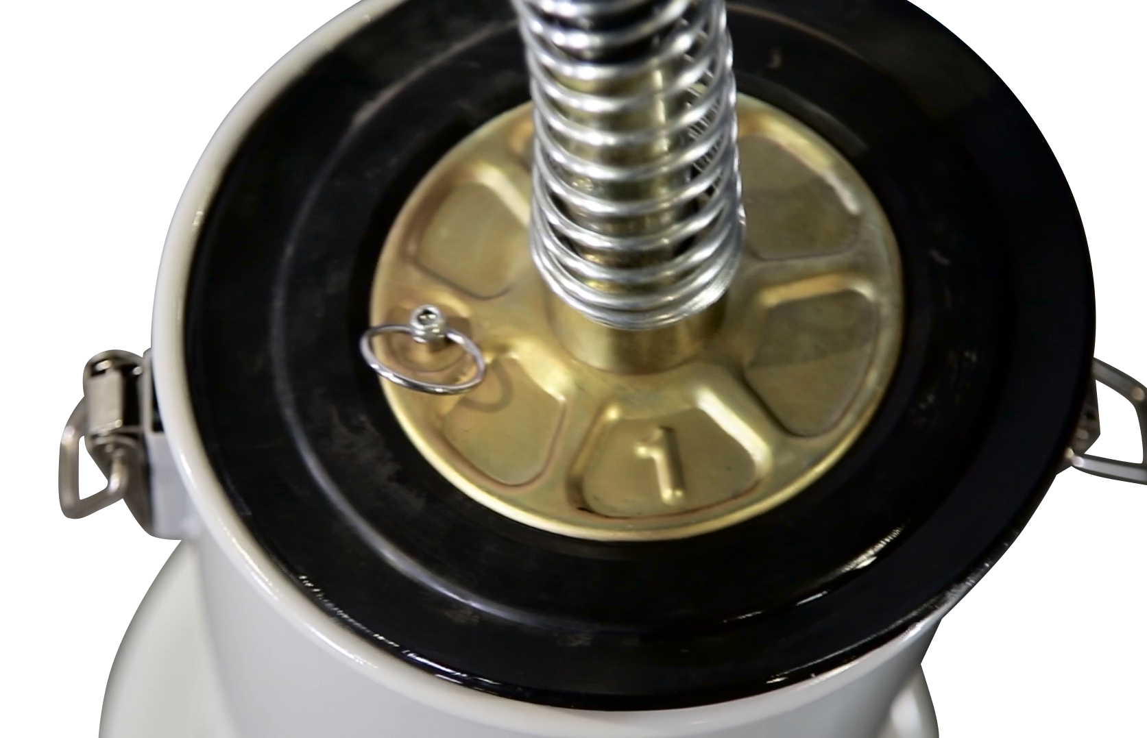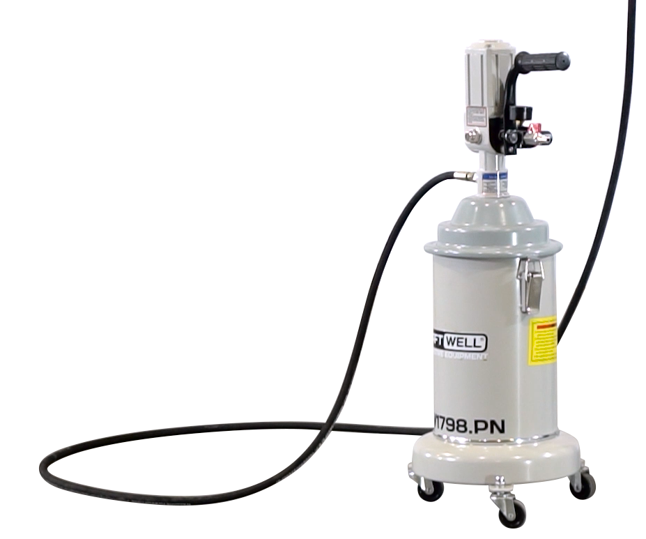 Нагнетатель солидола с пневмоприводом KRW1798.PN работает от линии сжатого воздуха давлением 6-8 бар. Для контроля и регулировки рабочего давления насос оснащен манометром с регулятором. Конструкция нагнетателя представляет из себя емкость, рассчитанную на 13 кг солидола, шланг длиной 2,5 метра, механический пистолет с жестким и гибким наконечником. Поворотные колеса, которыми оснащен нагнетатель, позволяет без труда перемещать его по горизонтальной поверхности.