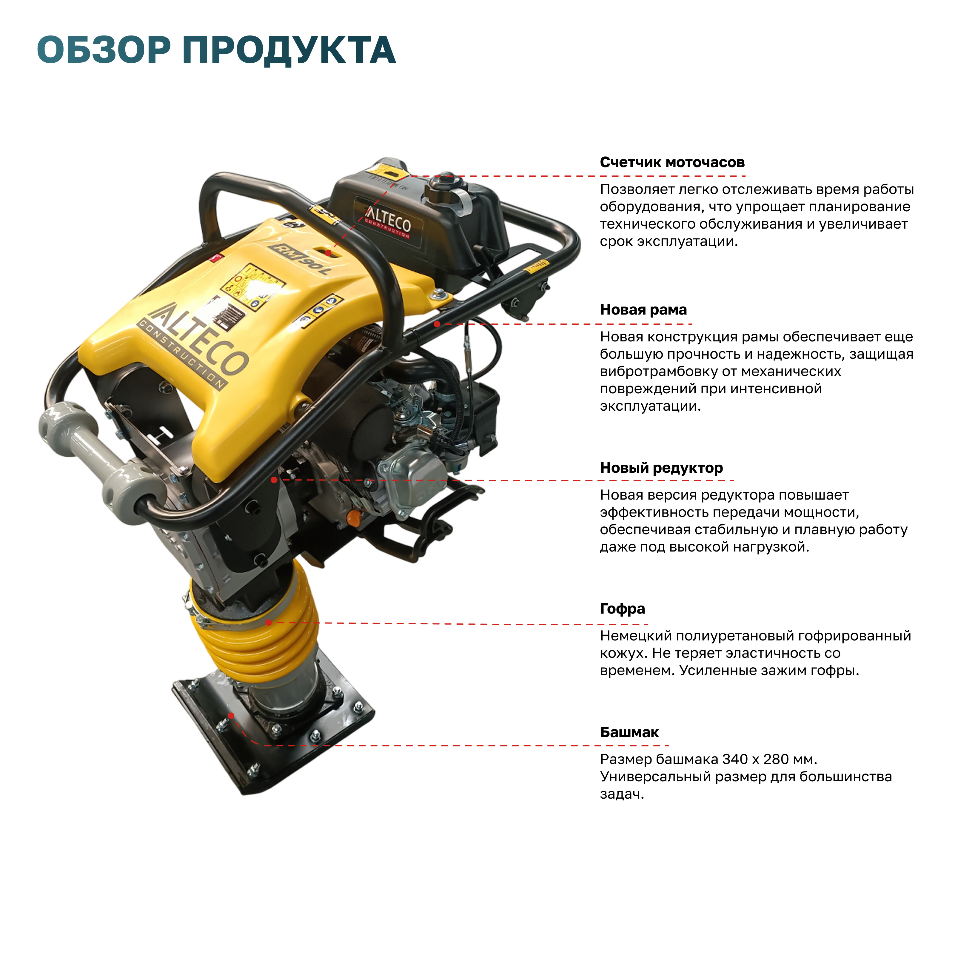 - Высокая производительность: 4-тактный двигатель с высокой мощностью гарантирует эффективное уплотнение различных материалов, включая сложные типы грунтов.