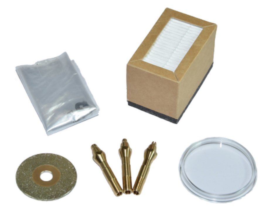 Точное определение длины износа при заточке в размере 0,3 мм достигается с помощью регулируемого калибра, таким образом, возможен минимальный расход электродов, сокращает время на процесс заточки, минимизирует выделение шлифовальной пыли и не изнашивается алмазный диск. С помощью регулируемого калибра так же можно снимать граты с вольфрамовых электродов при сварке алюминия. |