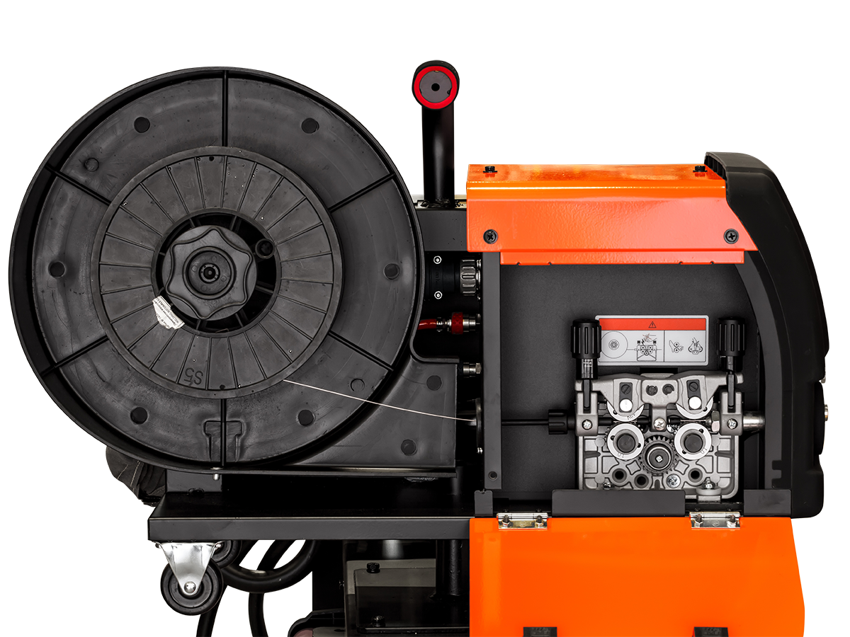 - Блочная система на прочной тележке: источник сварочного тока, подающее устройство и теплообменник