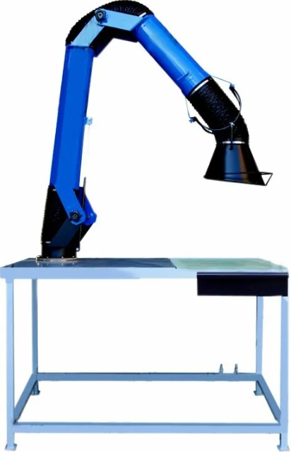 Удаление вредных веществ, образующихся при сварке, осуществляться с помощью подъемно-вытяжного устройства. ПВУ поворачивается на 360 градусов вокруг своей оси, легко перемещается и фиксируется в нужном положении. Воздухоприемная воронка данного устройства вращается в нужную сторону на 110 градусов от оси в любой плоскости.