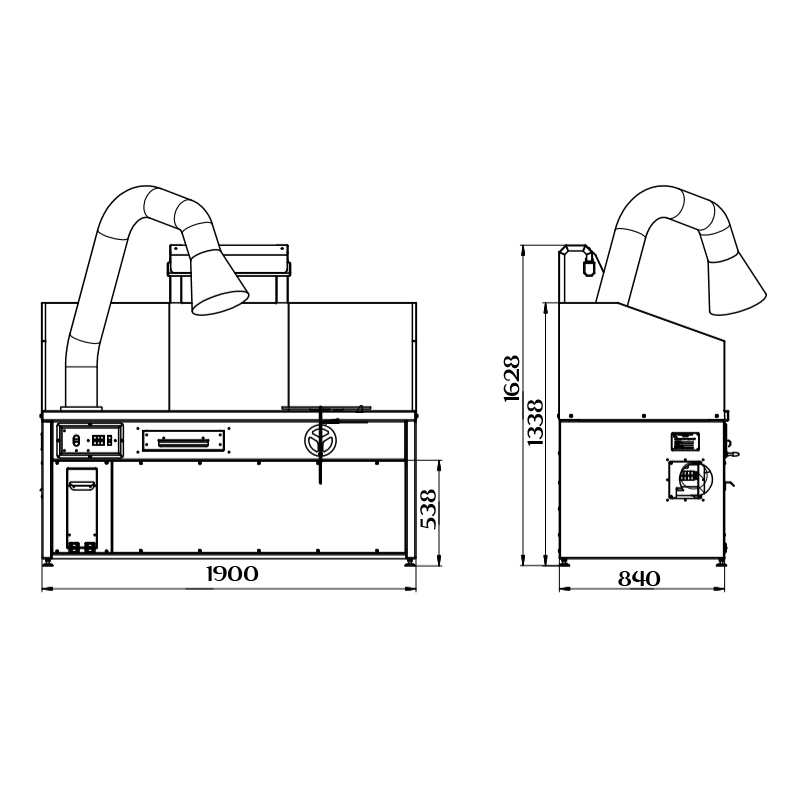 Удаление вредных веществ осуществляется с помощью подъемно-поворотного вытяжного устройства (ПВУ), установленного на боковой стенке стола. ПВУ поворачивается на 360 градусов вокруг своей оси, легко перемещается и фиксируется в нужном положении. Воздухоприемная воронка данного устройства вращается в нужную сторону на 110 градусов от оси в любой плоскости, снабжена подсветкой.