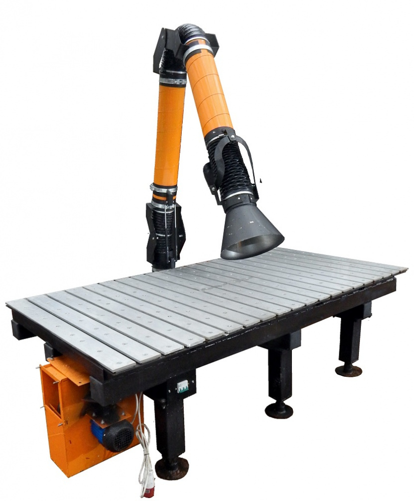 Отбор воздуха, загрязненного сварочным дымом и аэрозолями производится с помощью поворотно-вытяжного устройства, расположенного на рабочей поверхности стола. Использование поворотно-вытяжного устройства позволяет расширить функциональные возможности данного оборудования, обеспечивая локальную вытяжку как с рабочей поверхности стола, так и за его пределами. Поворотно-вытяжное устройство подключается к центробежному вентилятору, осуществляющему необходимое разряжение воздуха. Центробежный вентилятор оборудован алюминиевым рабочим колесом оригинальной конструкции, что (по сравнению со стальным рабочим колесом, которое обычно используется в аналогичных изделиях) существенно улучшает шумовые характеристики оборудования, а так же уменьшает пусковые токи электродвигателя. Кроме того, центробежный вентилятор имеет интегрированную систему шумоизоляции, позволяющую снизить уровень шума до 50 дБА.