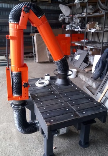 Стол оборудован поворотно-вытяжным устройством, легко вращающимся вокруг собственной оси и принимающим различную форму за счет гофрированных соединений. Используя ПВУ можно осуществлять работы не только на столе, но и на расстоянии 2 метров от него. Разряжение воздуха происходит посредством встроенного вентилятора.