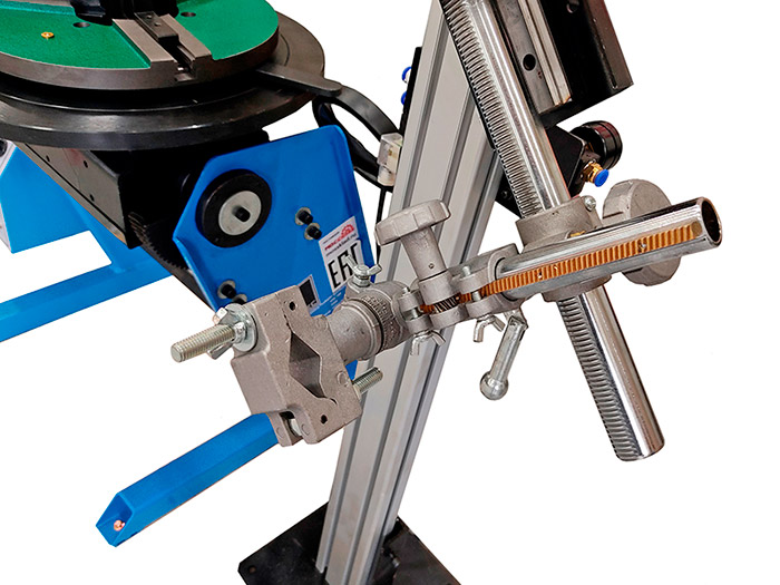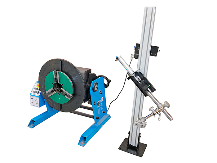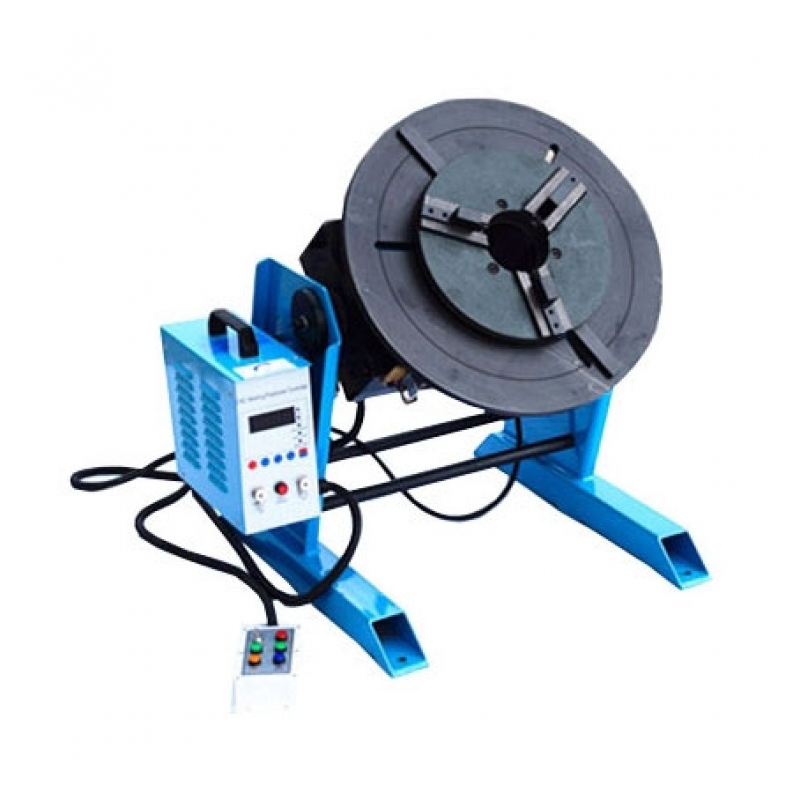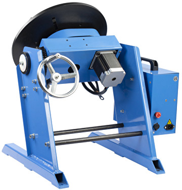 Сварочный позиционер CNC-300 предназначен для сварки кольцевых швов деталей весом до 300 кг. Оснащён шаговым двигателем и программируемым блоком управления, который позволяет задавать угол поворота планшайбы в диапазоне от 0º до 360º, угол поворота стола с точностью до 1º, устанавливать время задержки начала вращения стола, а также регулировать скорость вращения планшайбы от 0,01 до 5 об/мин. Позиционер CNC-300 позволяет облегчить работу сварщика, обеспечить точное позиционирование свариваемых заготовок и повысить качество сварных работ. Конструктивно позиционер CNC-300 представляет собой поворотный стол с углом поворота планшайбы от 0º до 90º, на котором размещаются и выставляются с заданной точностью свариваемые элементы. Планшайба имеет сквозное отверстие 90 мм. Позиционеры CNC-300 комплектуются самоцентрирующимся патроном и пультом дистанционного управления – педалью.