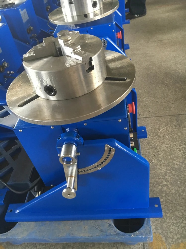 Сварочный вращающийся стол WDBWJ также называют вращателем или кантователем либо позиционером. Конструктивно представляет собой поворотный стол диаметром 350 мм с углом наклона планшайбы от 0° до 90°, на него крепится свариваемая деталь либо зажимной патрон KD-300/WP-300, позволяющий надежно зажимать заготовки диаметром 80-280 мм, с дополнительными губками 10-400 мм. Планшайба имеет сквозное отверстие диаметром 45 мм. Максимальный ток сварки составляет 250 ампер.