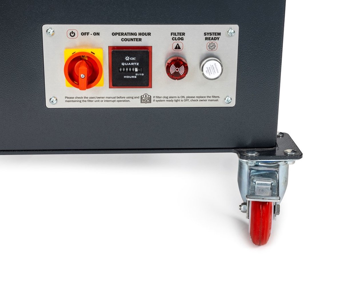 - Панель управления оснащена индикатором эффективности работы фильтра, переключателем Вкл/Выкл, счётчиком моточасов, индикатором корректного вращения вентилятора;